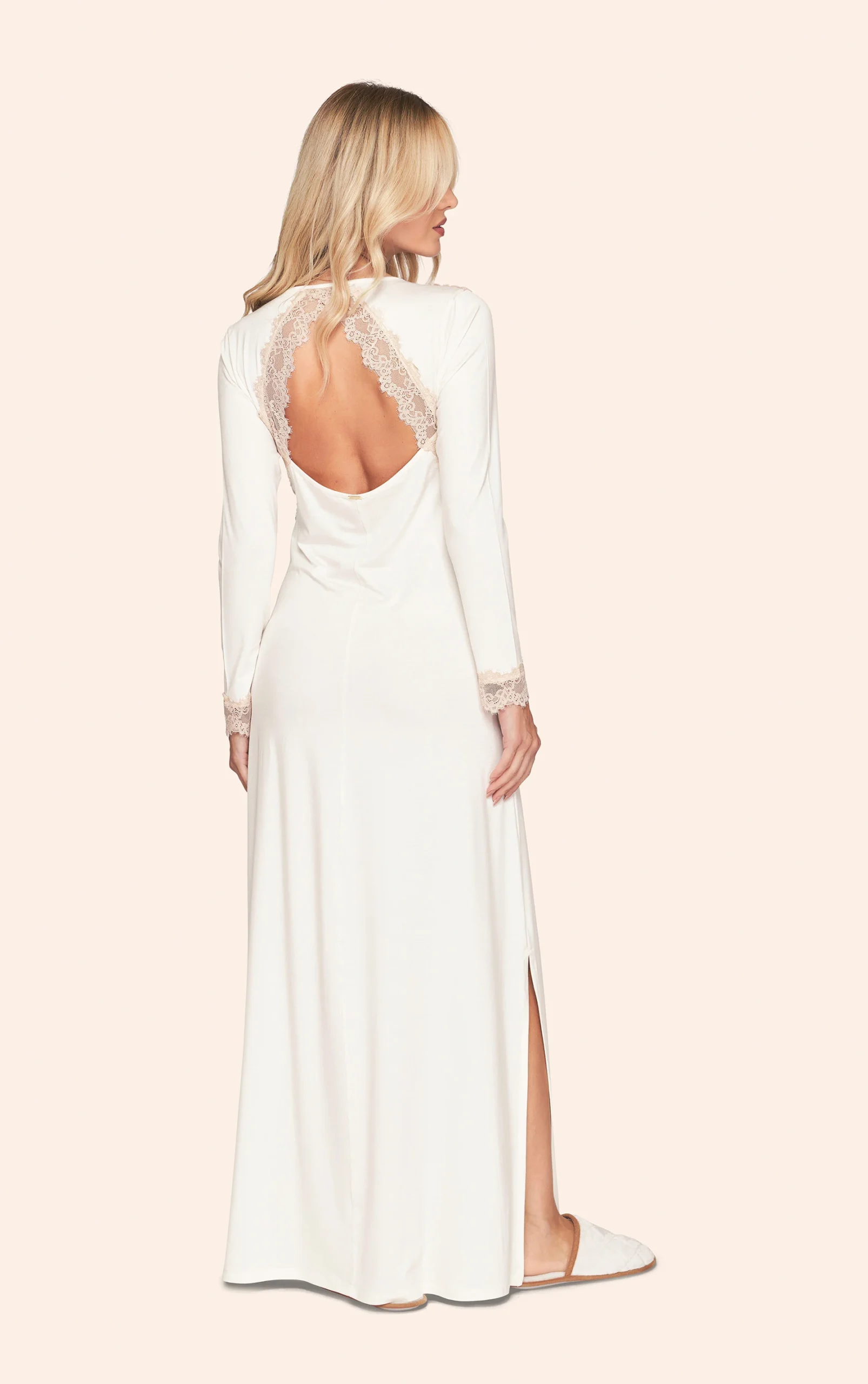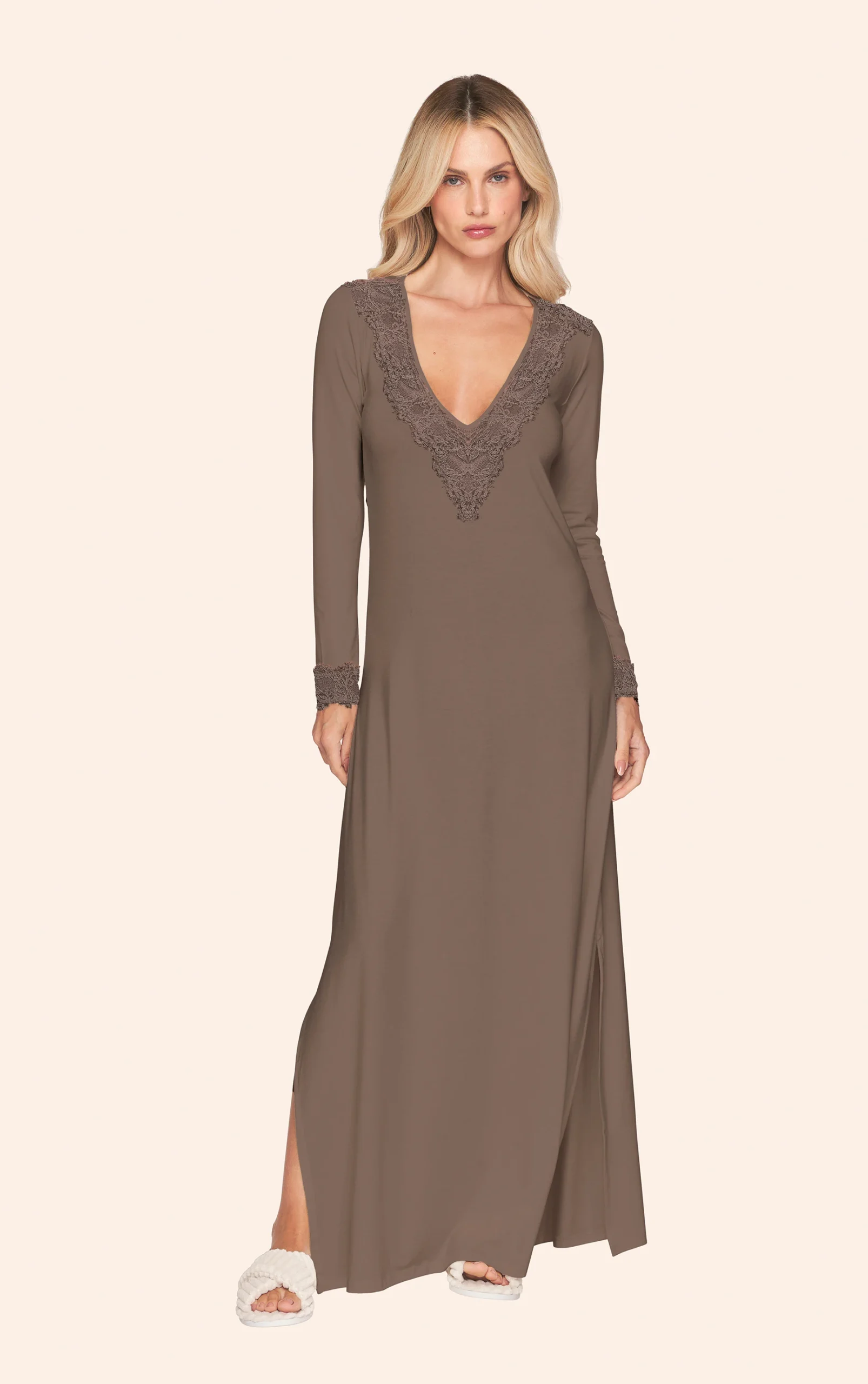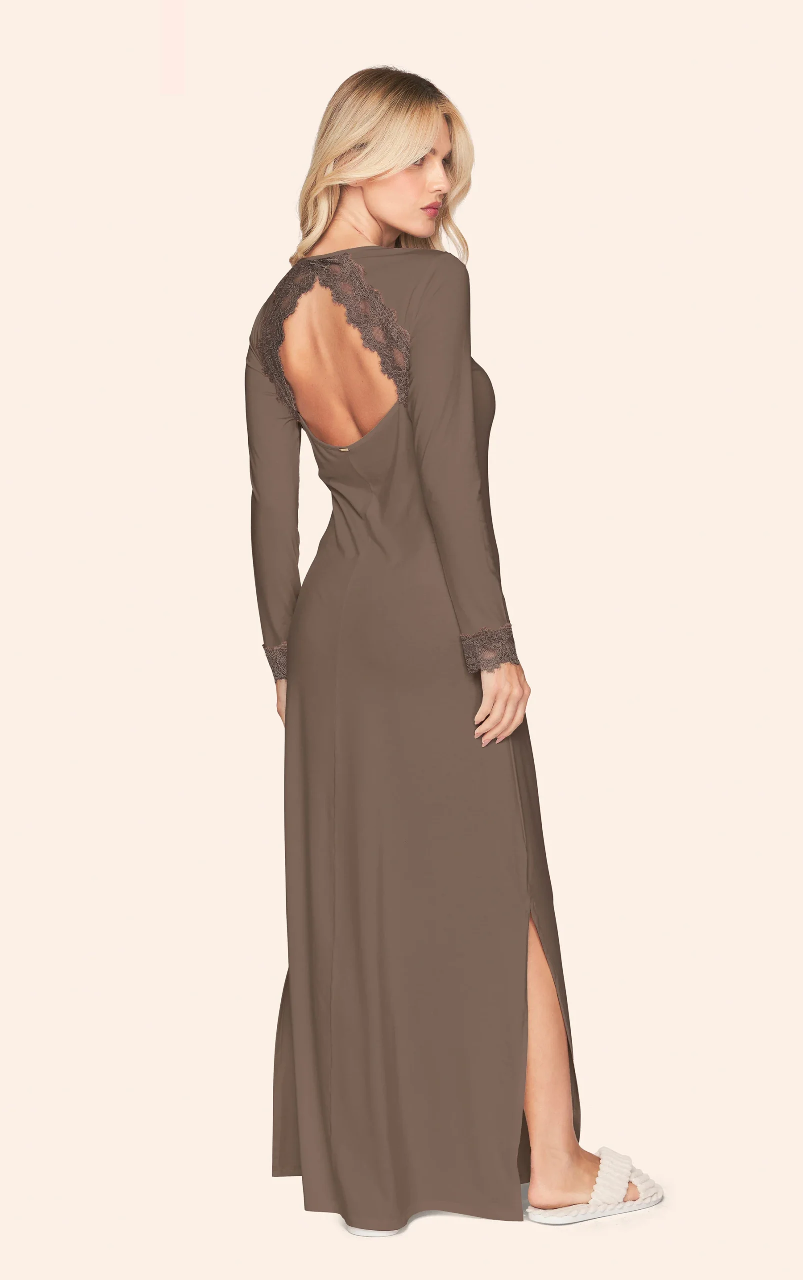 Camisola longa feminina confeccionada em malha Lyo Prime, uma novidade desta coleção que une elegância e conforto. Desenvolvido com fibra de liocel, o tecido possui toque macio e caimento suave, proporcionando uma sensação agradável sobre a pele. Sua modelagem clássica valoriza a silhueta com elegância, enquanto a fenda lateral acrescenta leveza e liberdade de movimento. O design é enriquecido por detalhes em renda aplicados no decote, ombros e punhos, criando um visual feminino e refinado. No centro do decote, um delicado pingente adiciona um toque especial de charme. Nas costas, a peça apresenta abertura com detalhe em renda e etiqueta decorativa, reforçando a sofisticação da camisola. Uma proposta elegante e confortável para momentos de descanso com estilo.