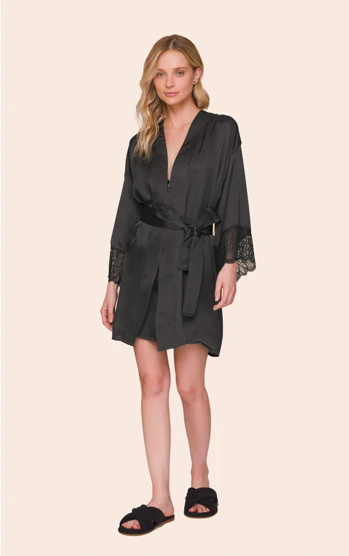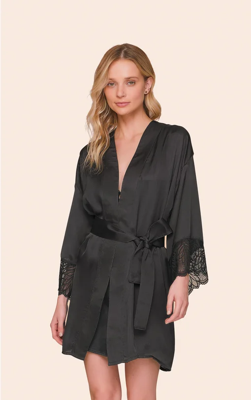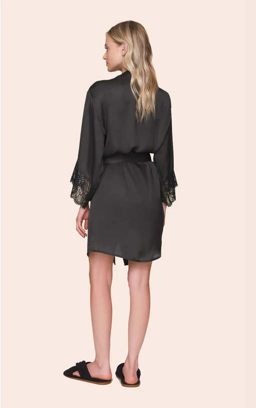 Chambre elegante, confeccionado em Satinê, tecido com toque de seda, brilho suave e caimento fluido, trazendo romantismo e leveza ao visual, na cor preta para um look sofisticado e atemporal. O modelo é valorizado por mangas com recortes em renda irregular, formando um acabamento delicado e sofisticado. A faixa para amarração na cintura proporciona ajuste personalizado, modelando o corpo de forma elegante e refinada.