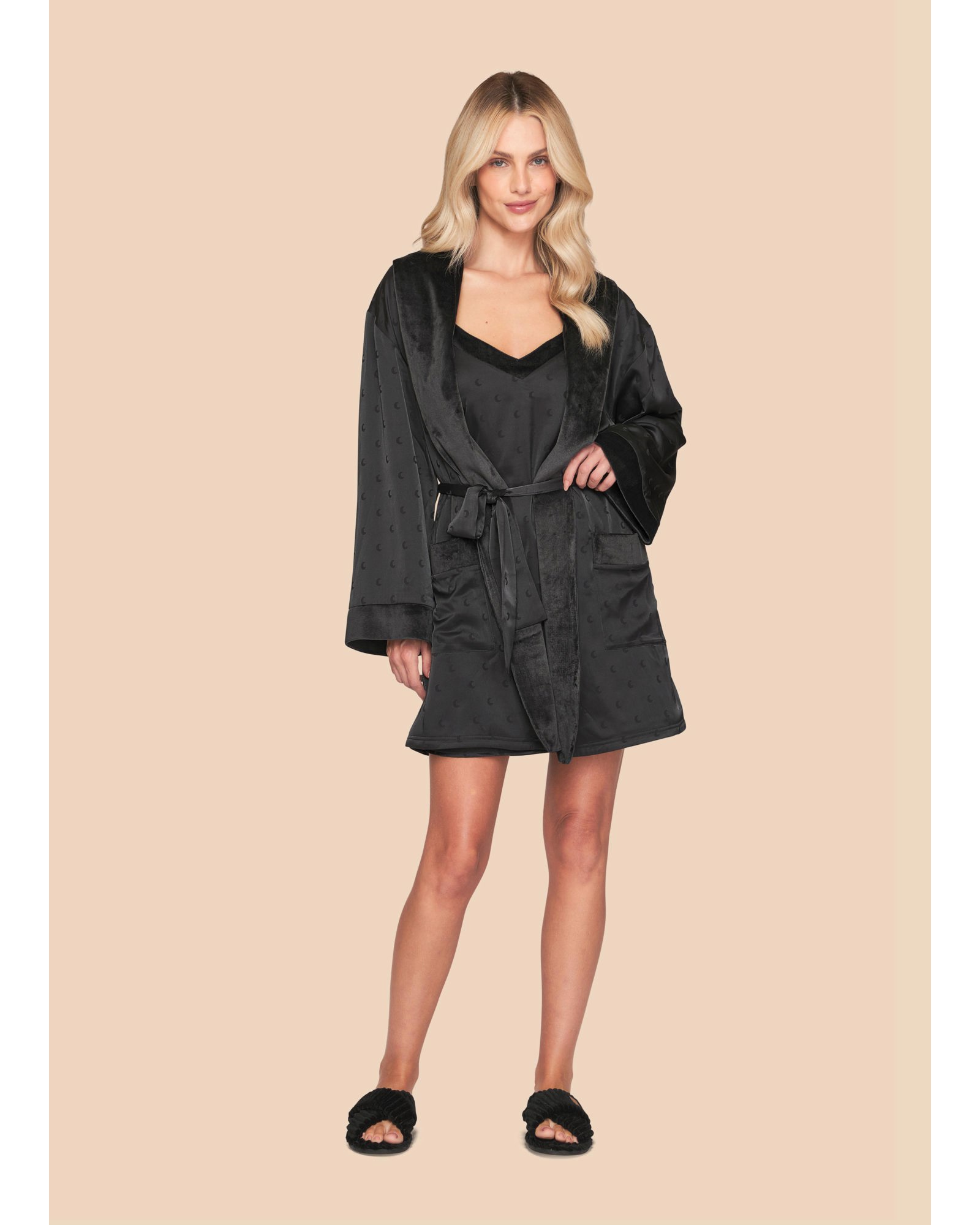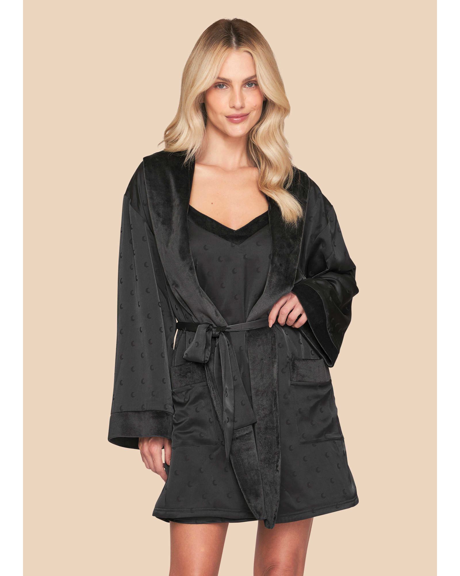 O Chambre é a peça perfeita para complementar seus momentos de descanso com sofisticação e elegância. Confeccionado em satinê jacquard, tecido com toque de seda, brilho suavemente acetinado e caimento fluido, além da textura delicadamente trabalhada. A modelagem com faixa para ajuste realça a silhueta com suavidade, enquanto as mangas, a abertura frontal e os bolsos recebem acabamento aveludado, que eleva a proposta sofisticada, tornando o chambre ideal para compor produções elegantes e marcantes.
