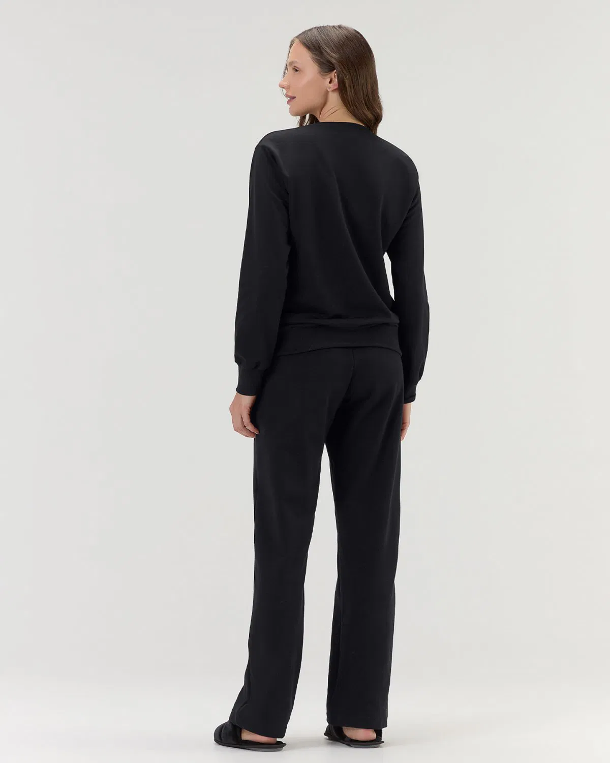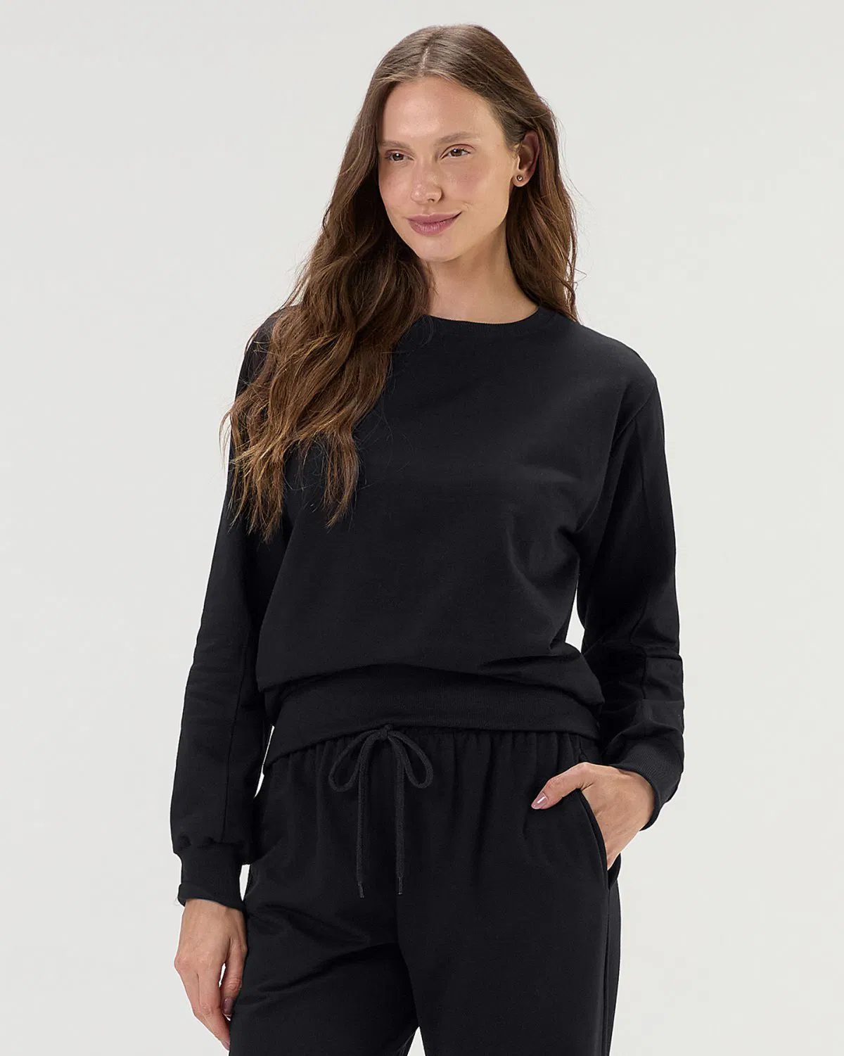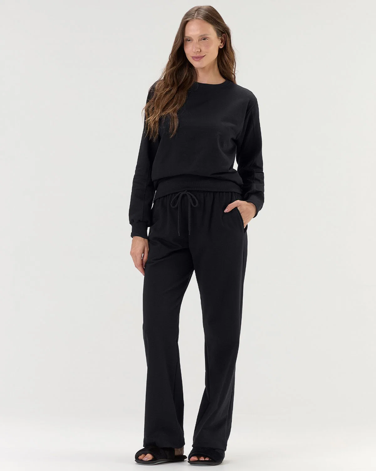 Conjunto feminino manga longa com calça em moletinho, macio e confortável. A calça wide leg vem com cadarço na cintura e bolsos, garantindo praticidade e liberdade de movimento, enquanto a modelagem soltinha traz conforto e estilo para o dia a dia.