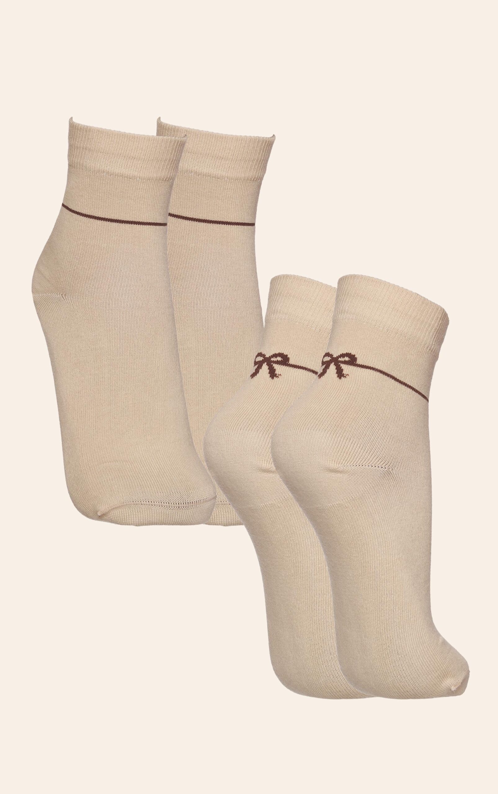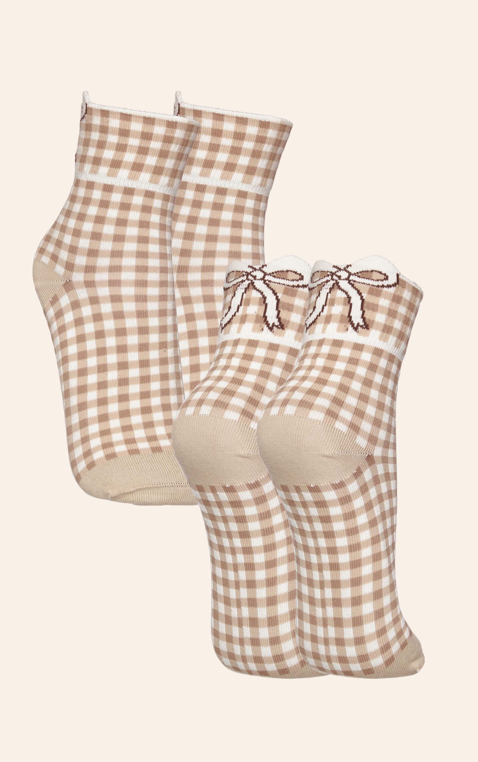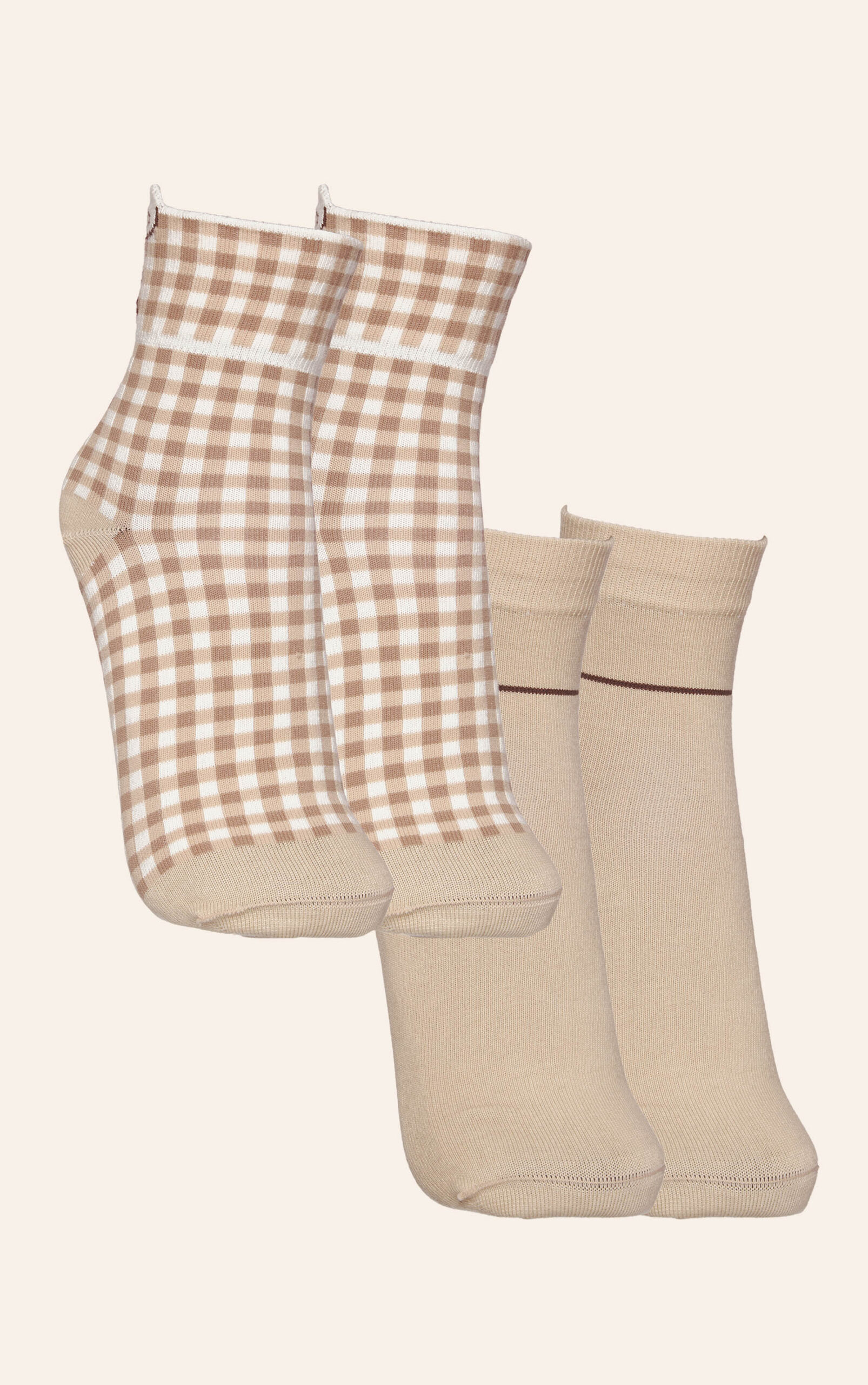 O kit de meias foi desenvolvido para completar os momentos de conforto com charme e praticidade. Confeccionadas em algodão macio e aconchegante, proporcionam toque suave e ajuste confortável ao tornozelo, acompanhando perfeitamente os pijamas e looks de homewear. As estampas são o destaque do kit: uma das meias apresenta visual clean e versátil, enquanto a outra traz o clássico xadrez em tons suaves, que transmite aconchego e elegância atemporal. O detalhe do laço aplicado adiciona um toque delicado e feminino, valorizando os momentos de descanso com leveza e estilo.