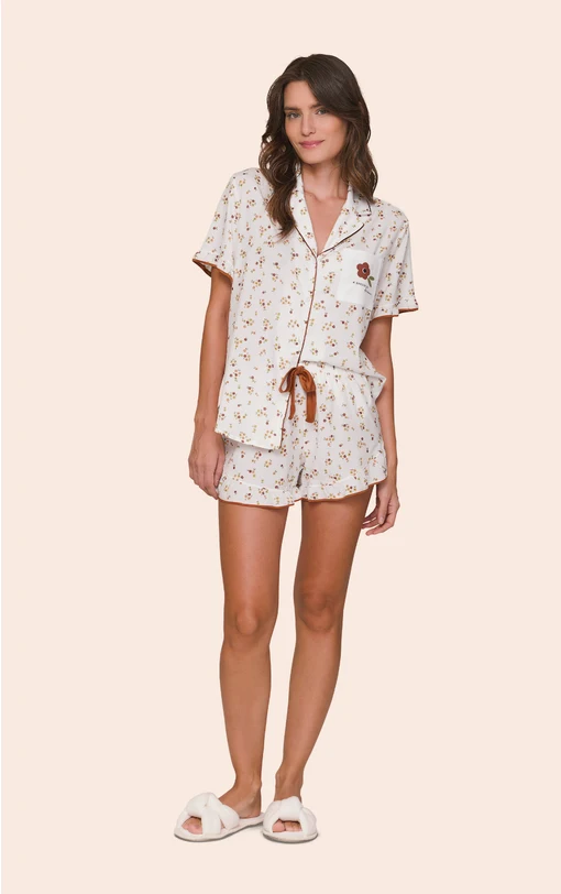 Pijama Aberto manga curta confeccionado em malha Sublime Touch, a malha exclusiva Lua Luá com toque pele de pêssego, que garante leveza e conforto para os seus momentos de descanso. Com modelagem clássica e estampa floral que exala feminilidade, o conjunto é composto por camisa com abertura frontal e fechamento por botões, e shorts com elástico no cós para melhor ajuste. O cordão aplicado na cintura traz um charme extra, enquanto os babados e filetes contrastantes valorizam o visual. O detalhe especial fica por conta do bolso com estampa localizada “A Garden of Dreams”, que adiciona um toque poético e delicado.