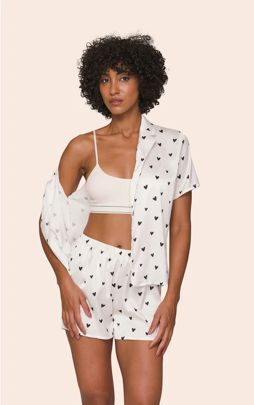 O clássico pijama aberto ganha um toque especial com essa estampa de mini corações. Confeccionado em satinê com toque de seda, brilho suave e caimento fluido, o conjunto conta com camisa aberta de botões, com um ar de elegância ao visual. O short com elástico na cintura complementa o look, garantindo conforto e ajuste perfeito.