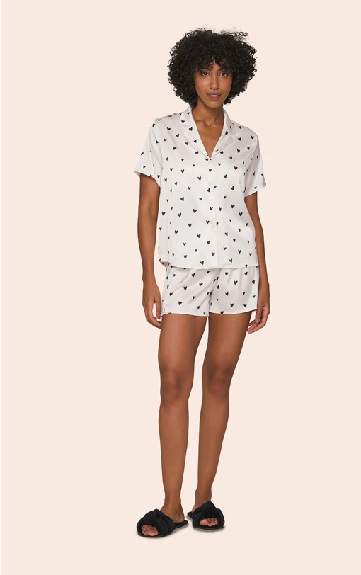 Pijama Aberto Feminino em Satinê All Print Camisa com Botões e Shorts HeartbeatPijama Aberto Feminino em Satinê All Print Camisa com Botões e Shorts Heartbeat
