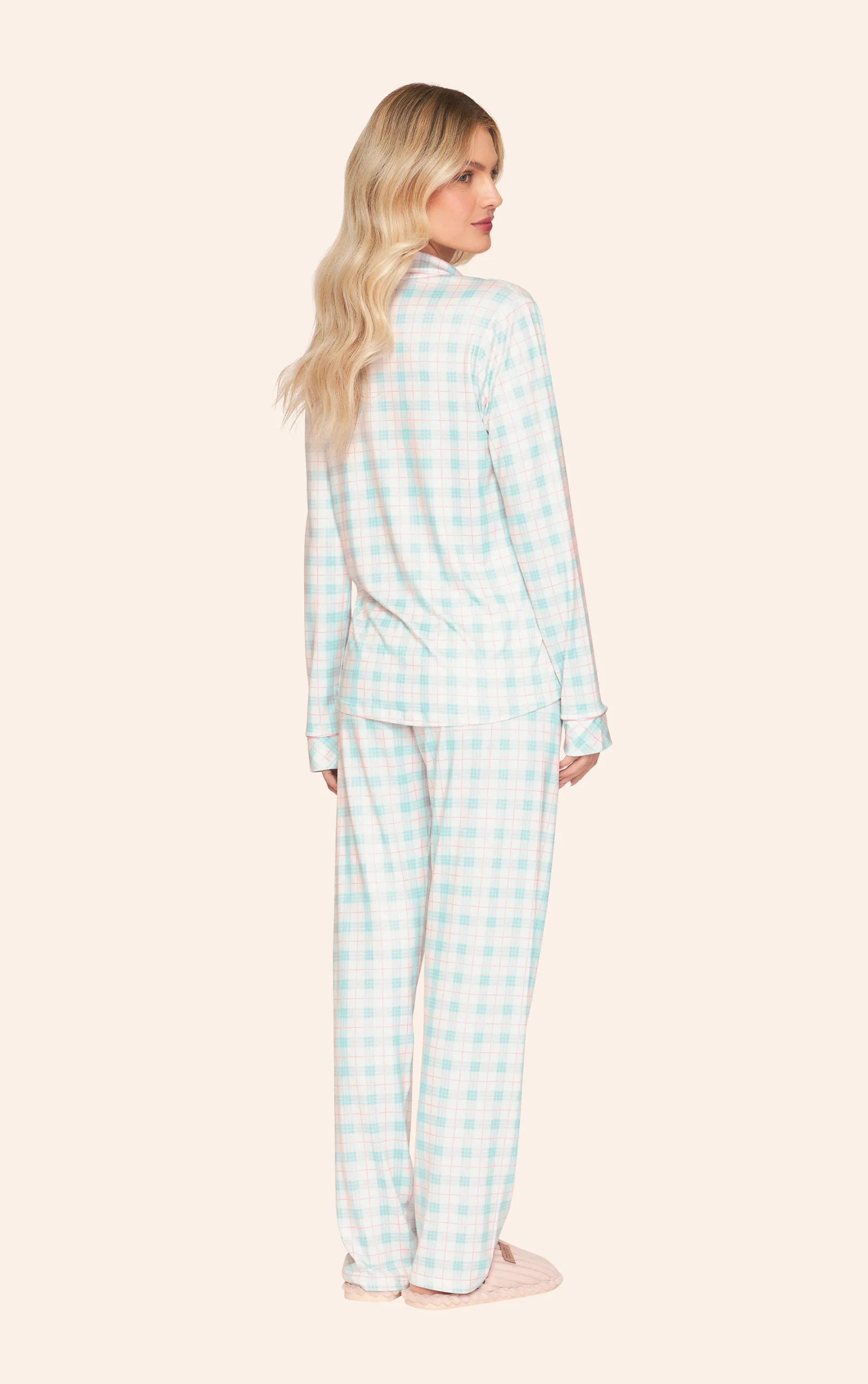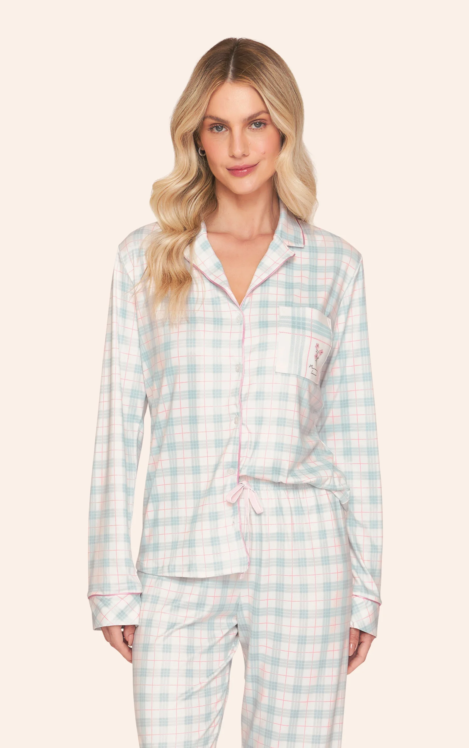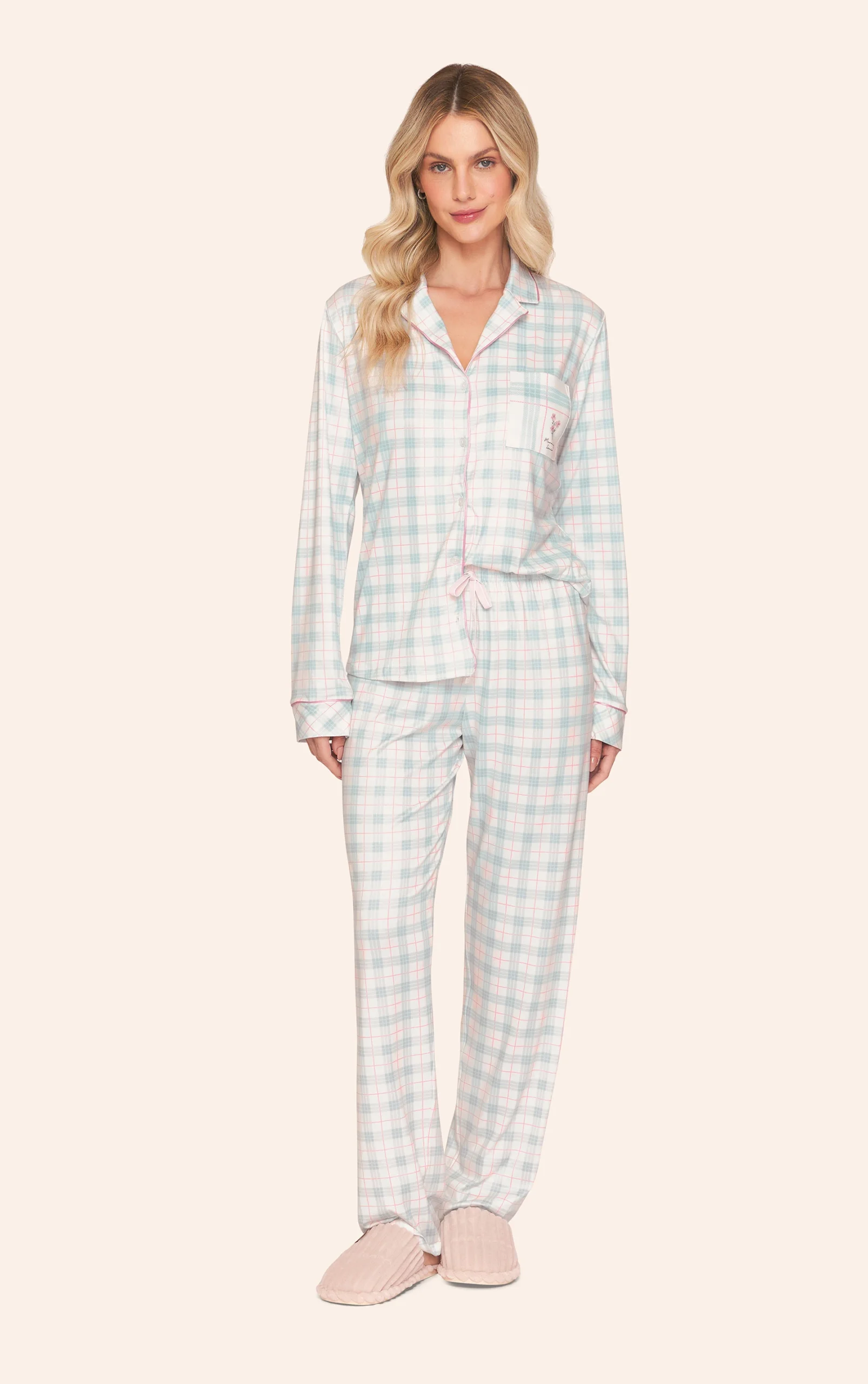 Pijama aberto feminino que une elegância e conforto em um design clássico e atemporal. Confeccionado em sublime touch, tecido de toque pele de pêssego que proporciona maciez e aconchego, é ideal para momentos de descanso com muito estilo. A blusa de manga longa possui gola tradicional, bolso funcional e fechamento frontal por botões, além de ser contornada por delicados filetes acetinados em cor contrastante que valorizam o acabamento da peça. A calça apresenta modelagem solta para maior conforto, cós com elástico e cordão decorativo para melhor ajuste. A estampa xadrez delicada reforça o visual acolhedor e sofisticado do conjunto.