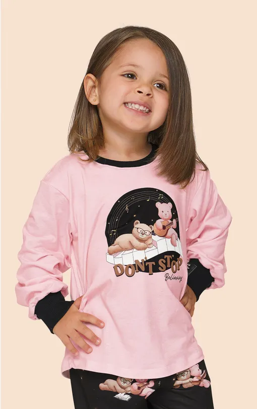 Um coordenado especial para os novos amigos ursos desta coleção: Nina & Steve! Esse dueto querido preenche os pijamas de forma encantadora, compondo melodias para os sonhos de toda a família! Pijama Baby de manga longa, confeccionado em sublime touch, malha com toque pele de pêssego. A blusa possui acabamentos na gola e punhos com tecido de ribana de cor contrastante. A calça recebe um elástico interno na cintura para melhor ajuste e conforto.