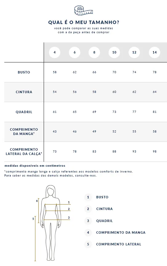 Composição: COMPOSIÇÃO BLUSA 96% POLIÉSTER / 4% ELASTANO COMPOSIÇÃO CALÇA 96% POLIÉSTER / 4% ELASTANO