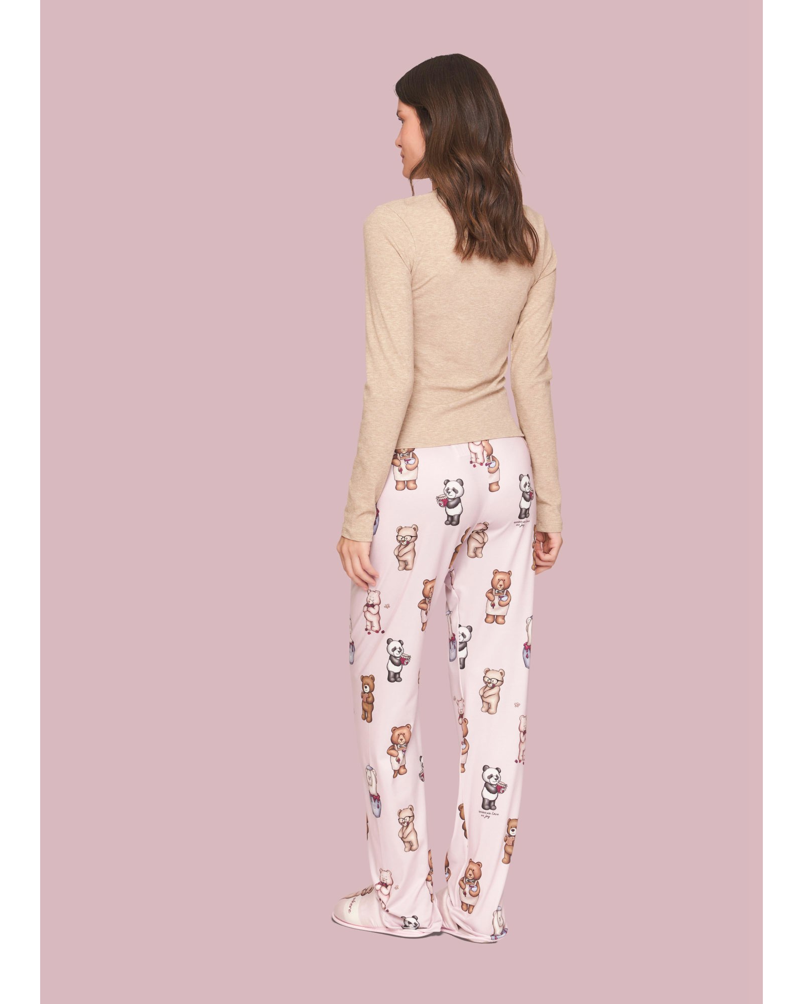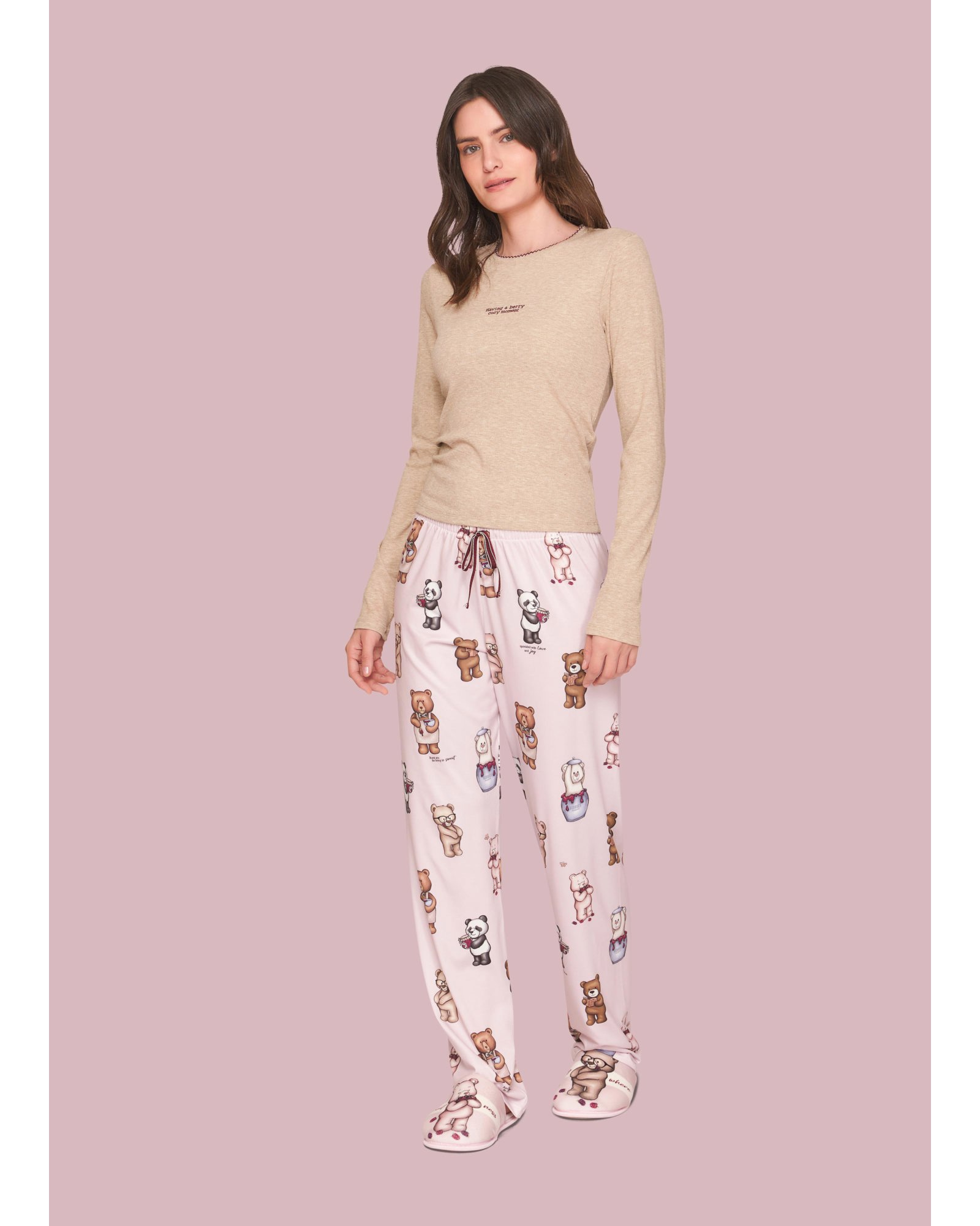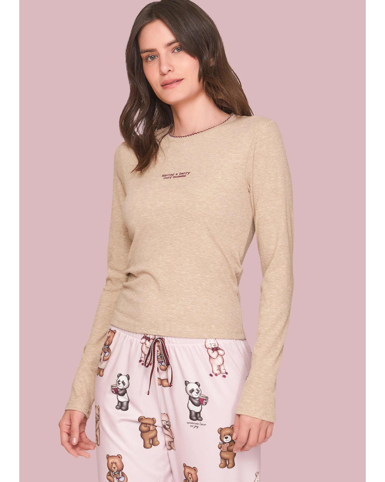 Pijama Comfort Especial desenvolvido para unir estilo, aconchego e delicadeza nos momentos de descanso. A blusa de manga longa, confeccionada em canelado melange, possui toque macio e acolhedor, com modelagem levemente ajustada ao corpo, bordado frontal delicado e acabamento bordado na gola, que adicionam charme e sofisticação ao visual. A calça é confeccionada em sublime touch, de toque pele de pêssego, com caimento confortável e elástico na cintura, além de um cordão decorativo. A estampa com nossos personagens ursos, em meio ao universo das geleias, adiciona doçura e delicadeza à proposta, resultando em um conjunto divertido e delicado para os momentos de descanso.