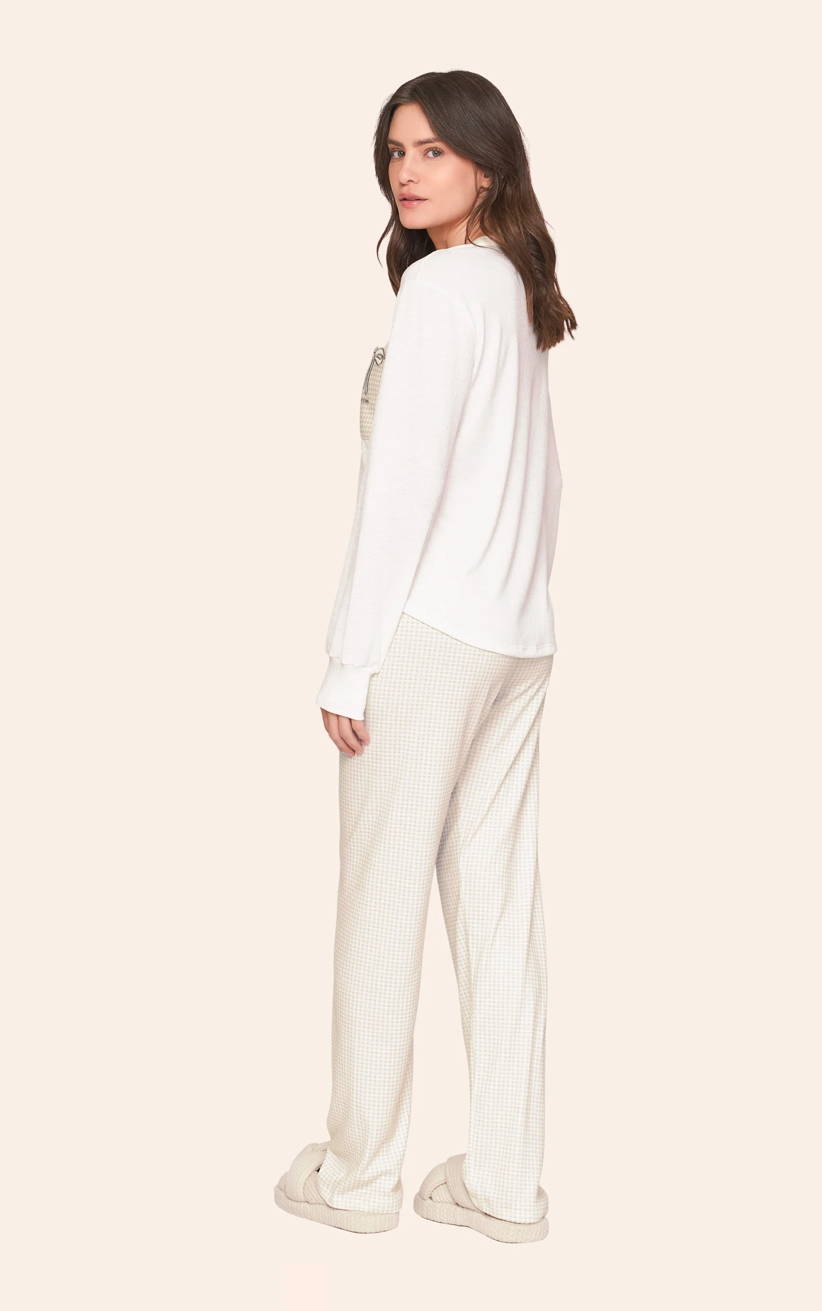 Pijama Comfort feminino confeccionado em malha cottage, tecido com textura suave, toque confortável e caimento leve, perfeito para momentos de descanso. A blusa lisa apresenta visual delicado e feminino, com bolso frontal estampado que recebe bordado localizado e detalhe em corte a laser, trazendo charme e sofisticação ao modelo. A calça em estampa xadrez complementa o conjunto com um toque clássico e aconchegante, criando uma combinação harmoniosa que transmite leveza, romantismo e o conforto ideal para relaxar em casa.