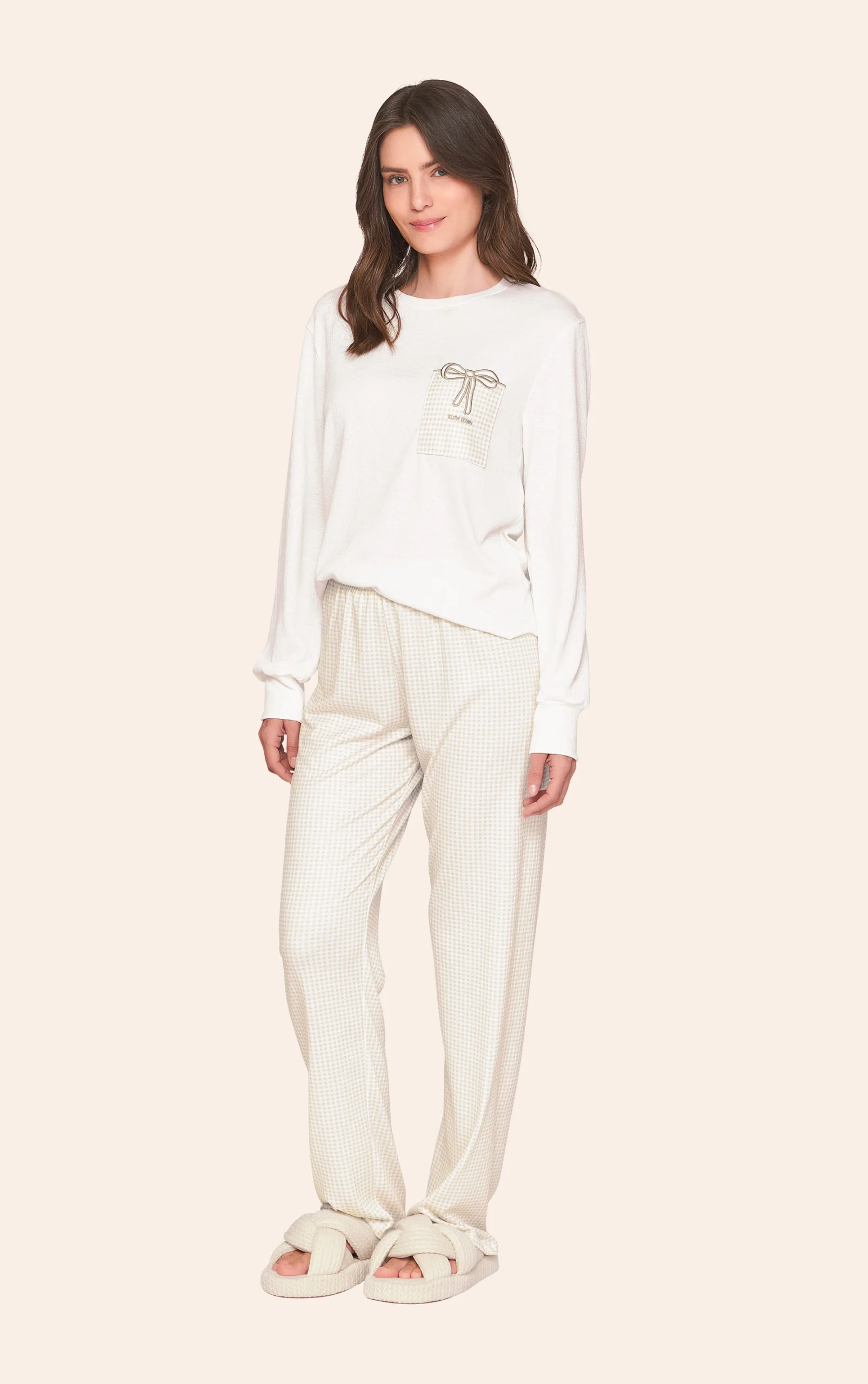 Pijama Comfort Feminino Xadrez com Bordado Slow DownPijama Comfort Feminino Xadrez com Bordado Slow Down