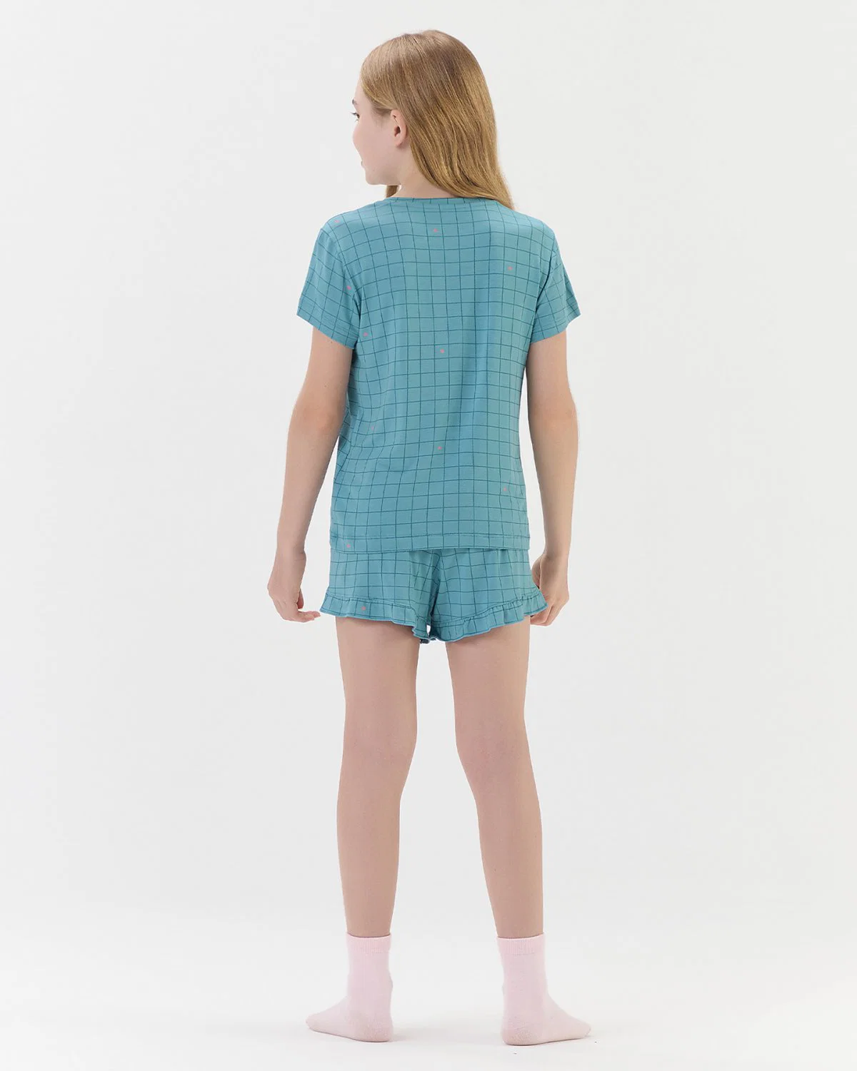 Confortável, fofinho e cheio de carinho! Esse pijaminha é feito em malha visco comfy, super macia e leve, perfeita para as noites de sono mais gostosas. Com fundo azul e estampa de xadrez grid em tom sur tom, ele traz um visual moderno e delicado ao mesmo tempo.