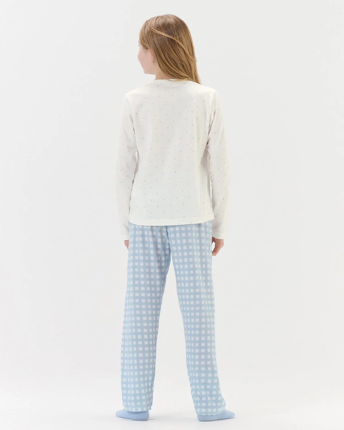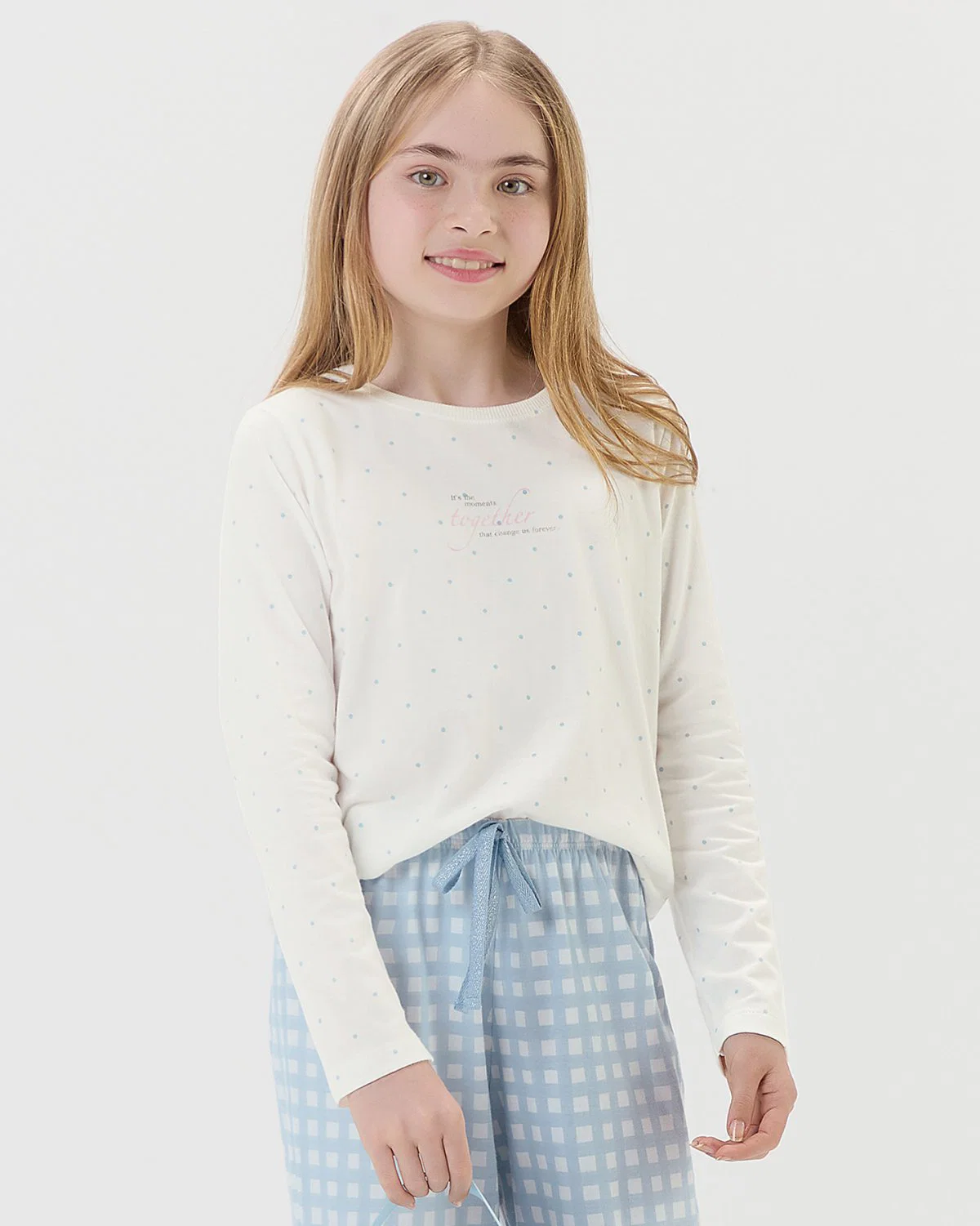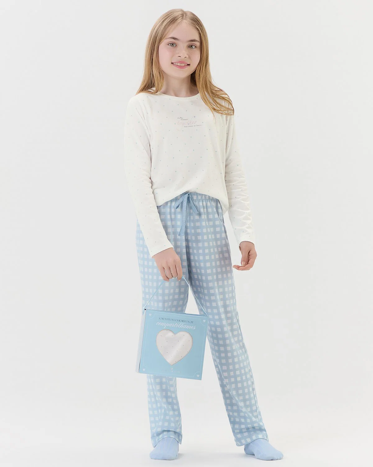 Pijama feminino infantil manga longa com calça, desenvolvido para unir conforto e estilo em noites de descanso. A blusa apresenta falso amarrador que adiciona um detalhe moderno, enquanto a estampa localizada confere personalidade e sofisticação ao conjunto. Um modelo prático e elegante para relaxar com bem-estar.