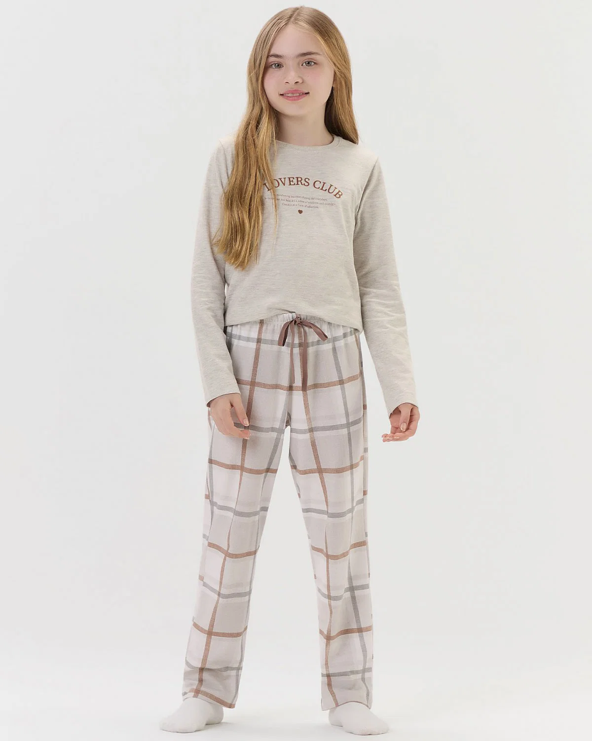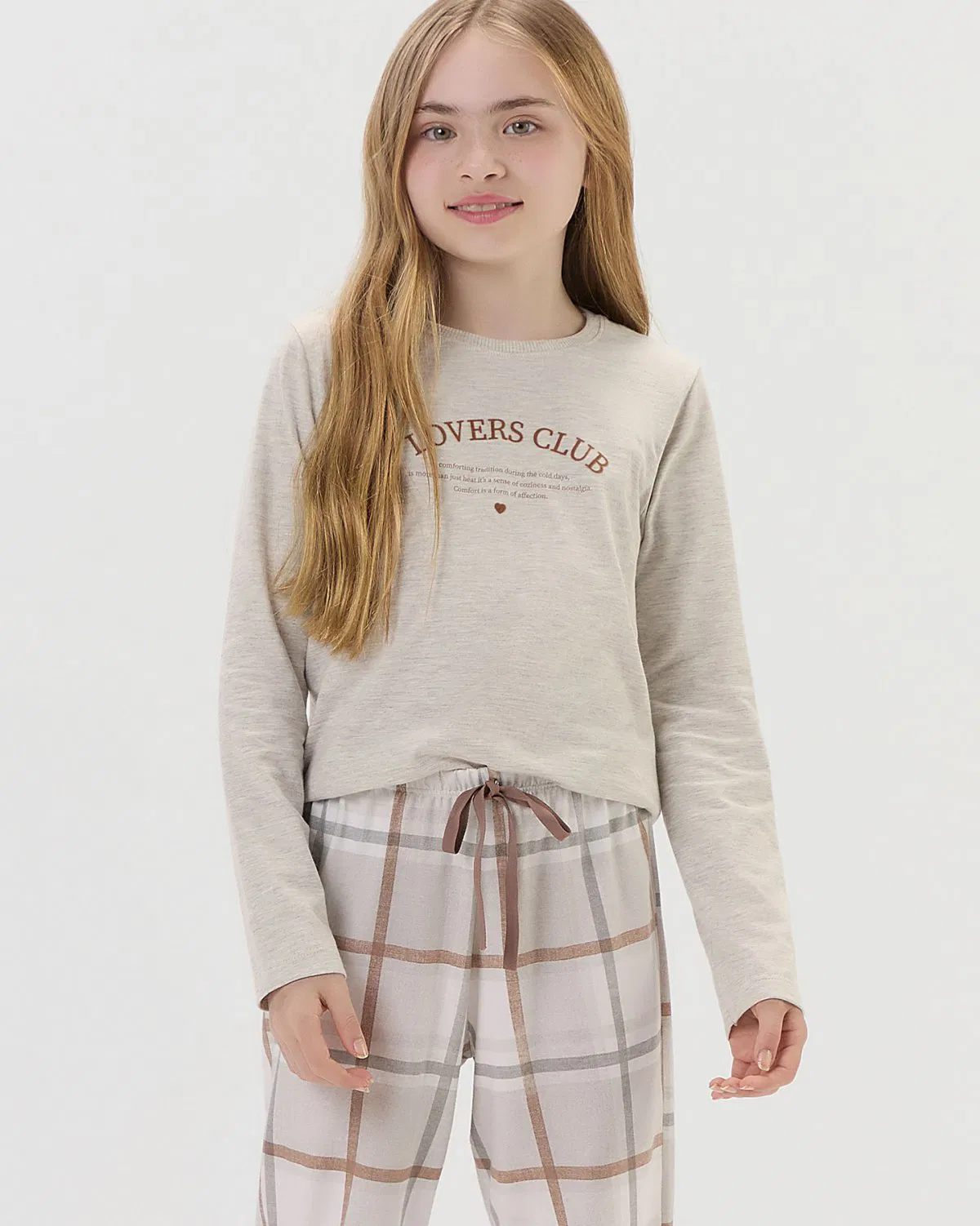 A calça combinando traz estampa rotativa em xadrez e detalhe em laço decorativo de fita de poliamida no cós, garantindo charme, feminilidade e conforto absoluto para o uso diário.