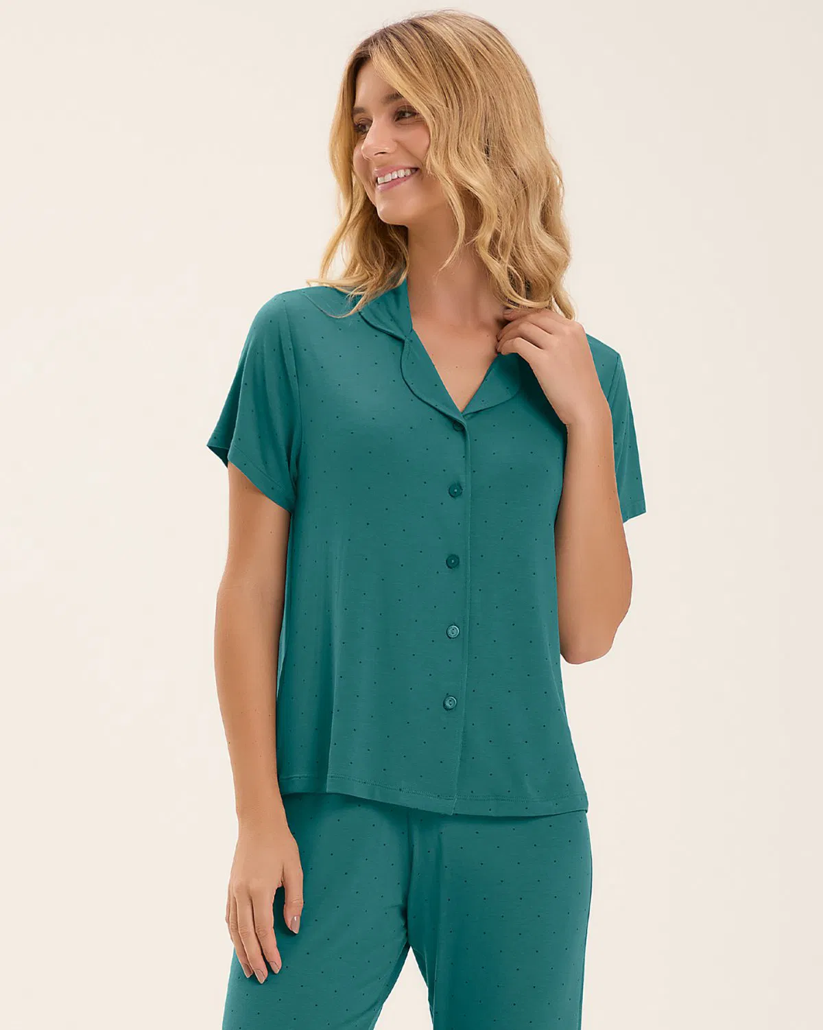 A blusa traz uma modelagem clássica americana, com abertura frontal em 5 botões e manga curta, valorizando o conforto sem abrir mão da elegância. O tom de verde sereno combinado com a estampa de poá em tom sur tom cria um visual sofisticado e delicado ao mesmo tempo.