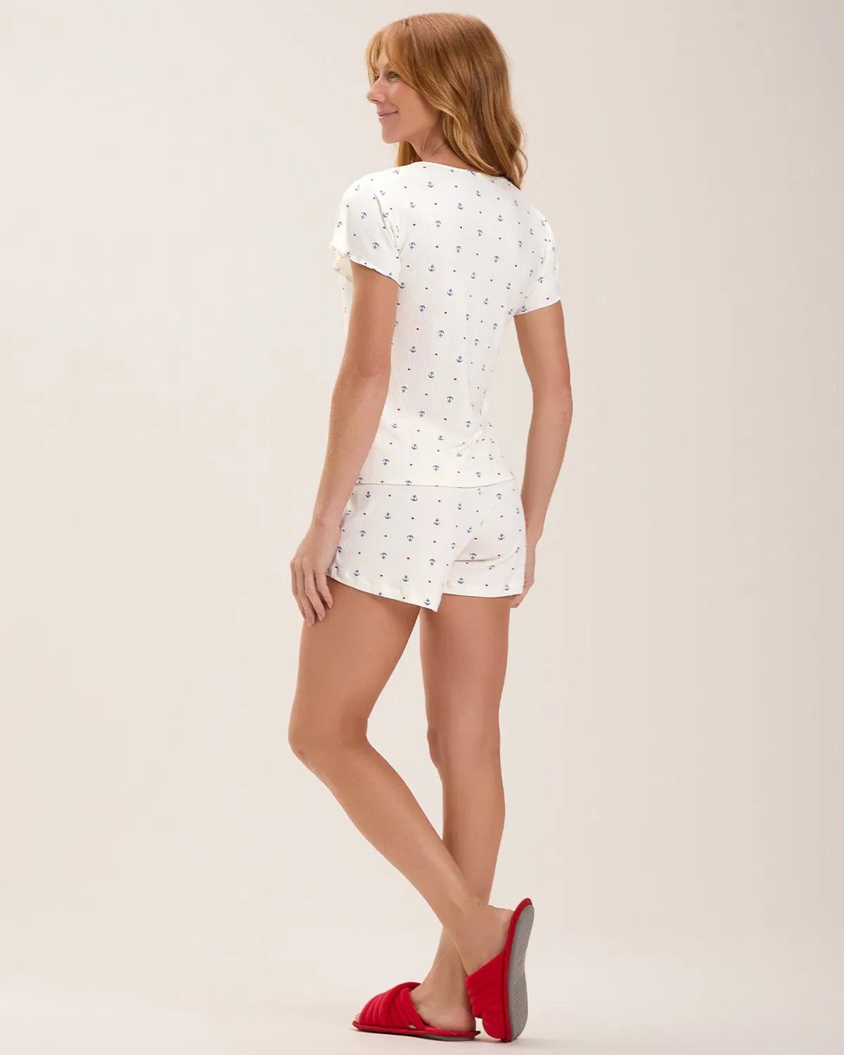 Confeccionado em canelado de viscose 4×3, o conjunto possui fundo off-white e uma delicada estampa rotativa de âncoras e corações, criando uma atmosfera suave e encantadora. O tecido garante um toque macio, alta respirabilidade e um caimento perfeito para o corpo.