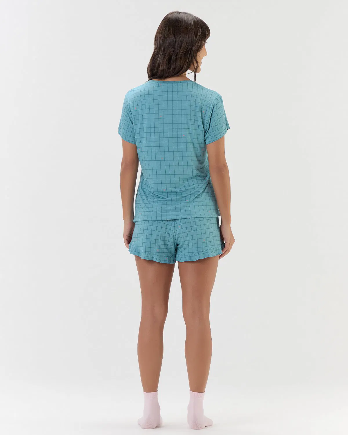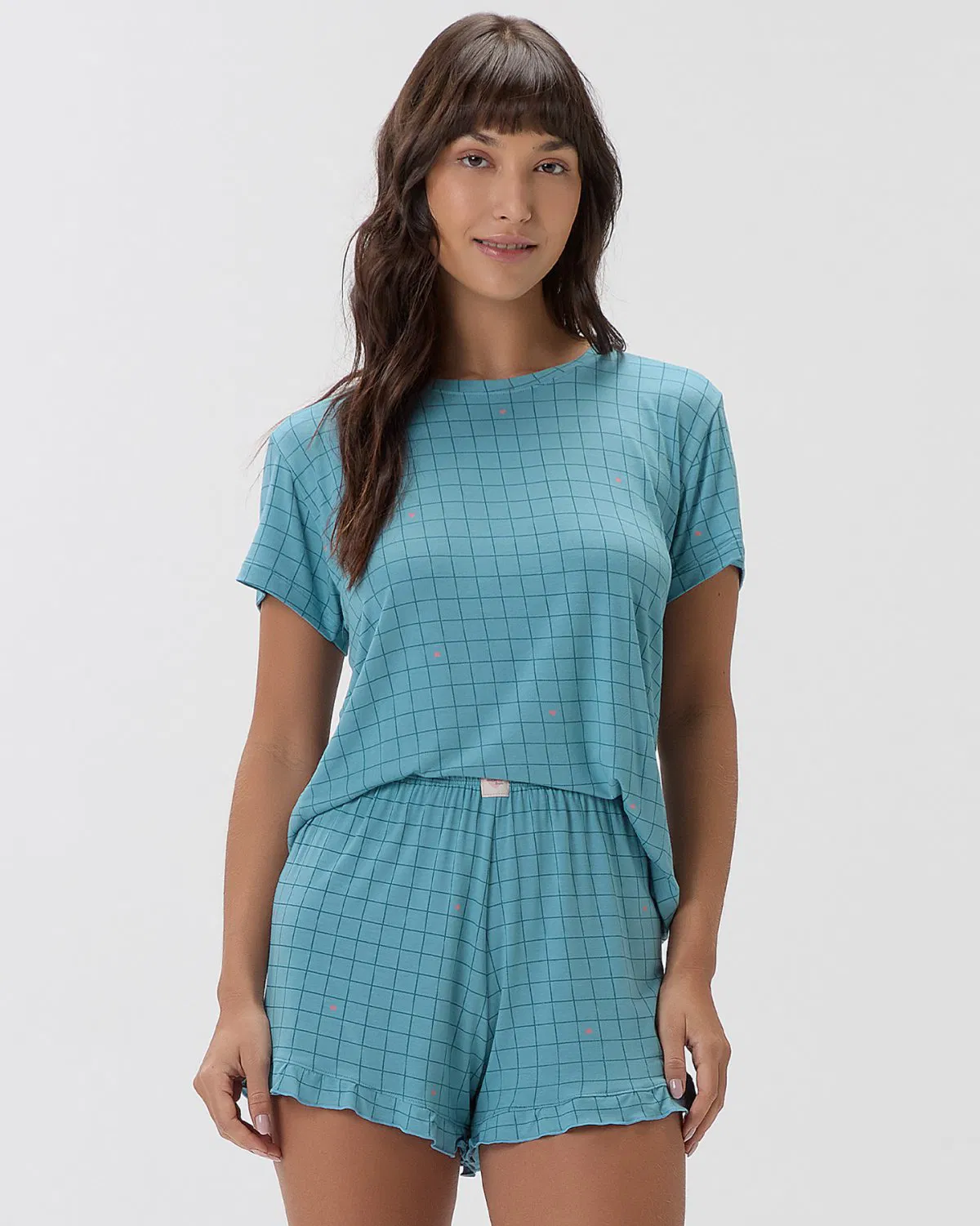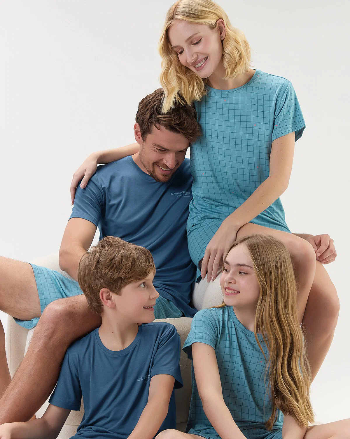 Charmoso e superconfortável, esse pijama é feito em malha visco comfy, que oferece toque macio, caimento leve e muito conforto para os momentos de descanso. Com fundo azul e estampa de xadrez grid em tom sur tom, o conjunto une modernidade e suavidade em um visual delicado.