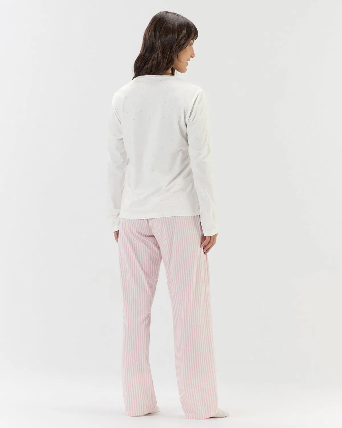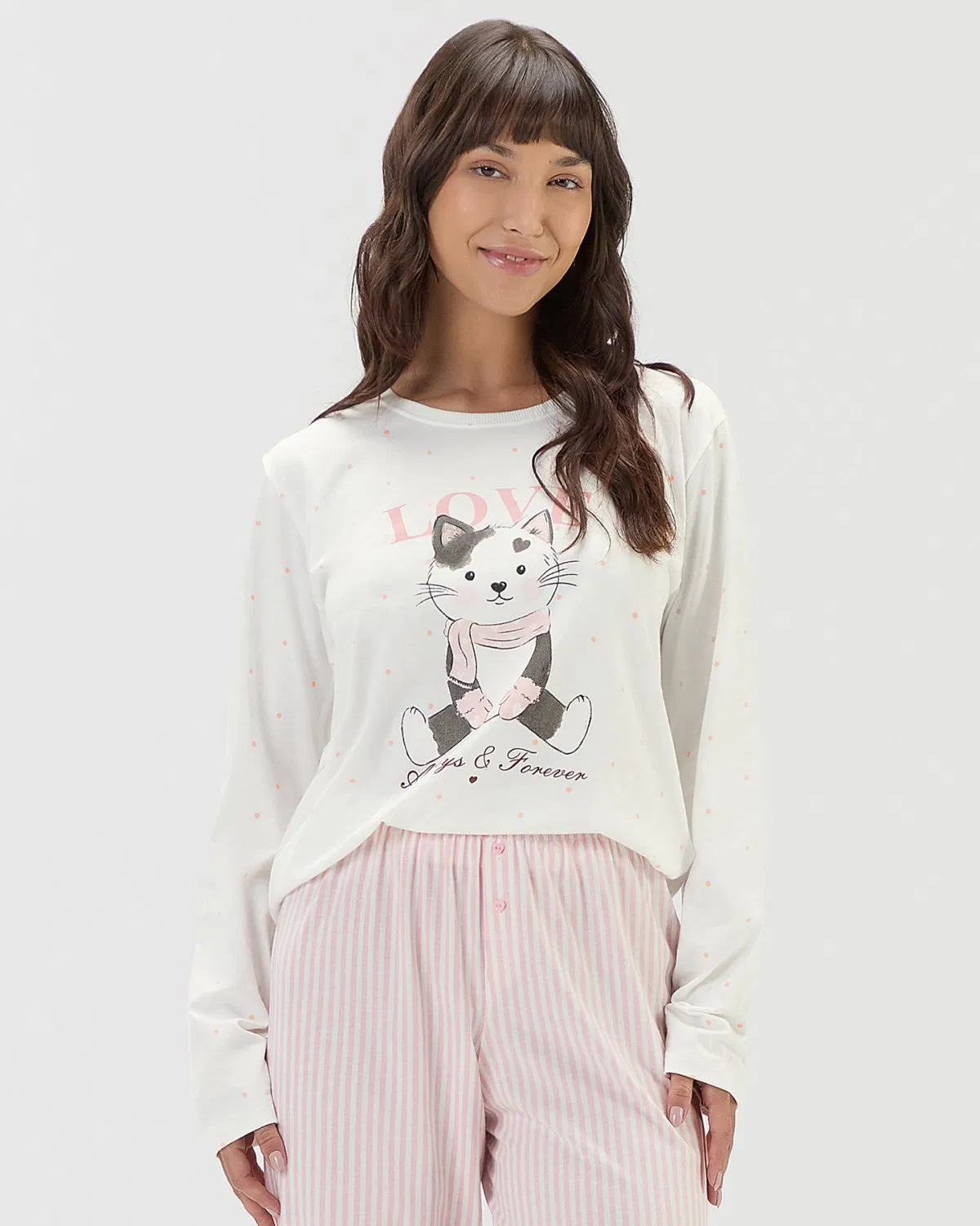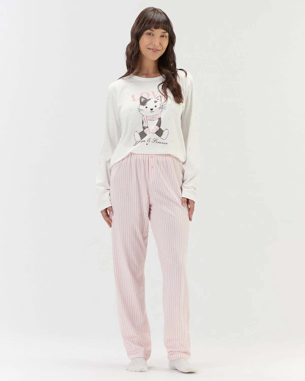 Pijama feminino de manga longa com calça, confeccionado em malha comfort de toque macio e agradável, ideal para noites de descanso com muito aconchego. A blusa, em fundo off-white, traz estampa de poá em tom de rosa e estampa localizada da mascote da nossa marca, a gatinha frajola Amora, usando cachecol e luvinhas, acompanhada da frase “Love, Always & Forever” (Amor, sempre e para sempre), que transmite delicadeza e carinho.