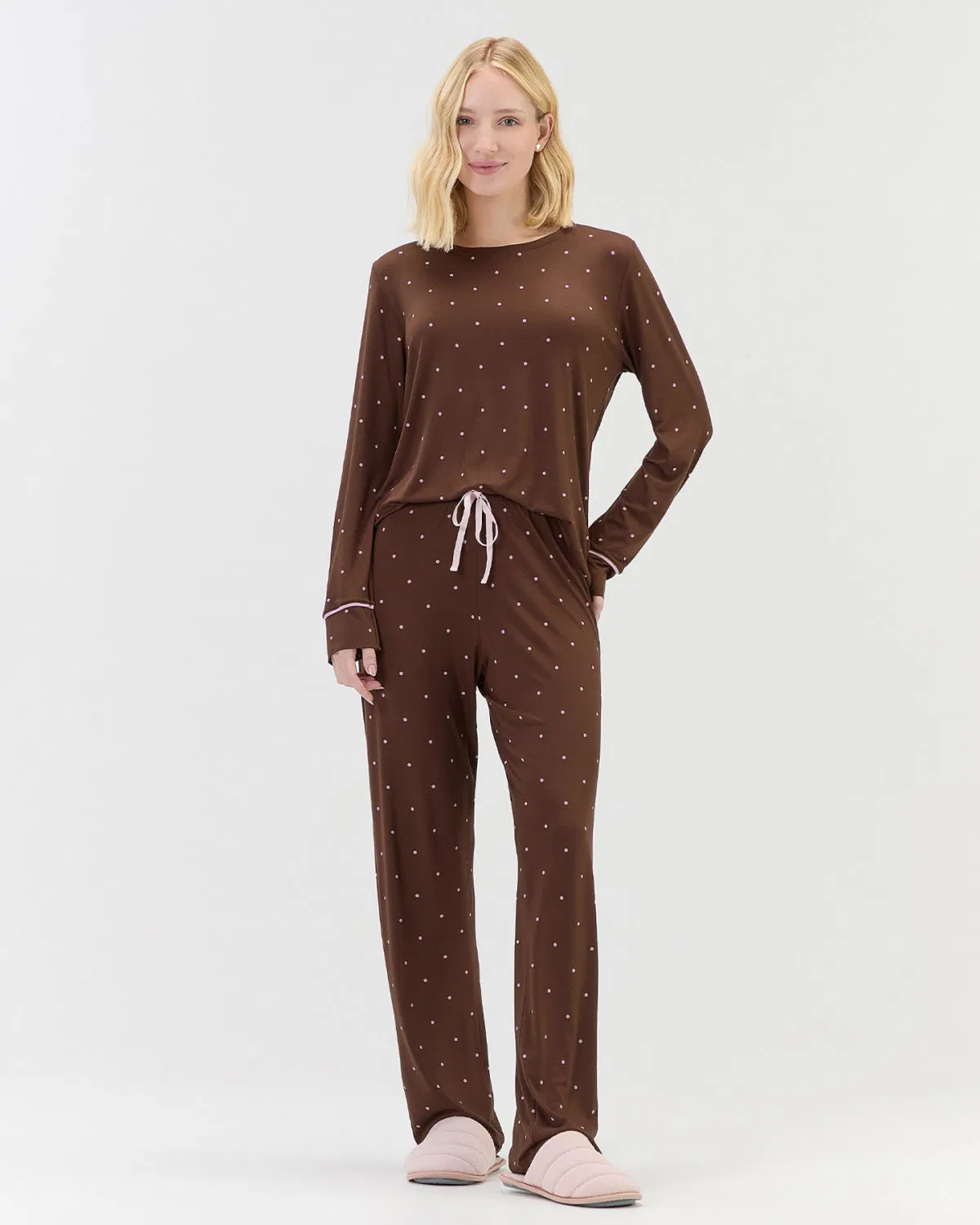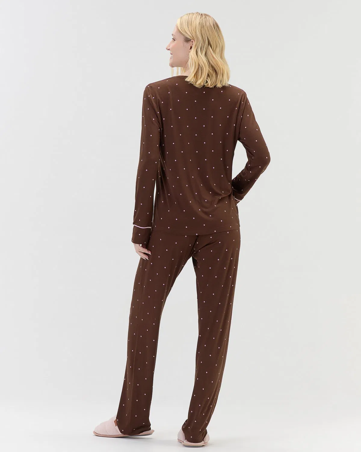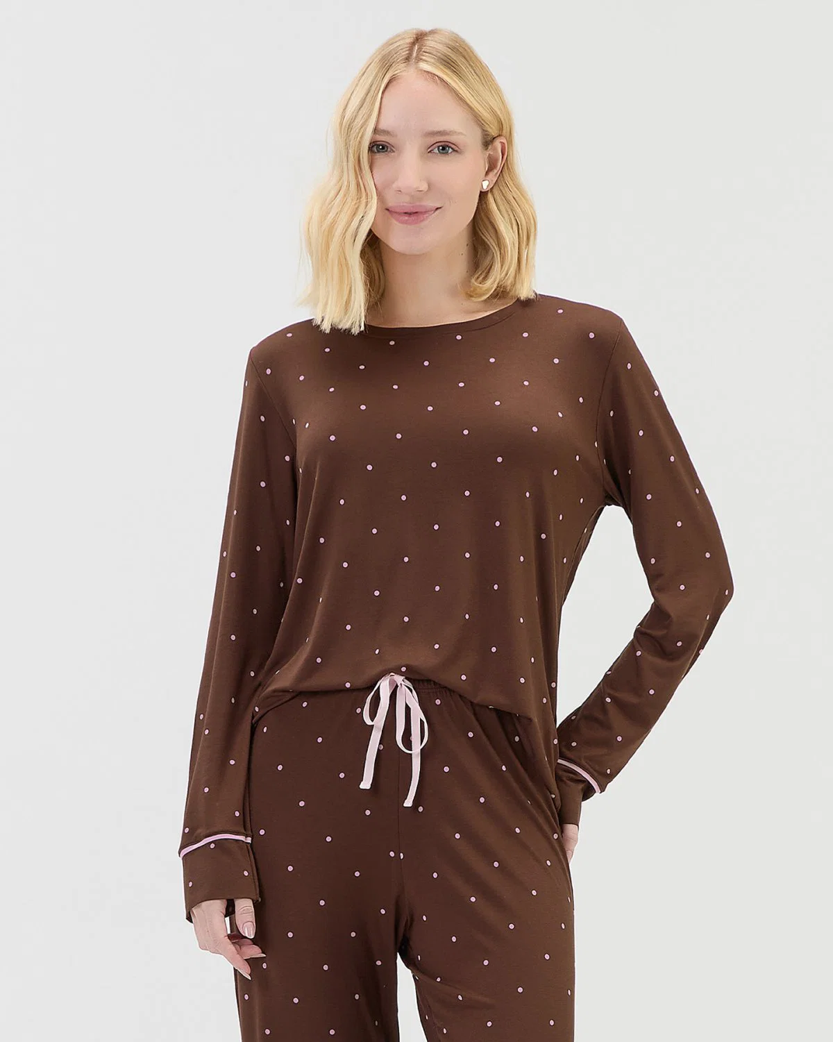 Com fundo marrom e estampa rotativa de mini poás cor de rosa, o conjunto traz um visual romântico e atemporal. A blusa de manga longa possui detalhe em filete rosa nos punhos, adicionando um toque de cor e delicadeza ao acabamento. A calça tem modelagem confortável e conta com amarrador decorativo rosa no cós, finalizando o visual com harmonia.