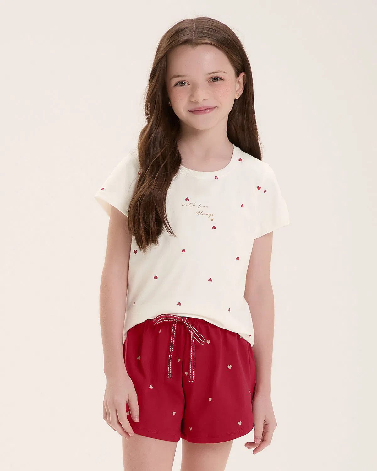 Pijama infantil feminino manga curta com shorts, feito em malha comfort para garantir muito conforto o dia todo. A estampa localizada em foil, com a frase “Amor sempre”, traz um brilho discreto e um toque fofo. O falso amarrador no shorts adiciona um estilo casual e divertido. Perfeito para quem busca um conjunto confortável e cheio de amor para brincar e descansar.