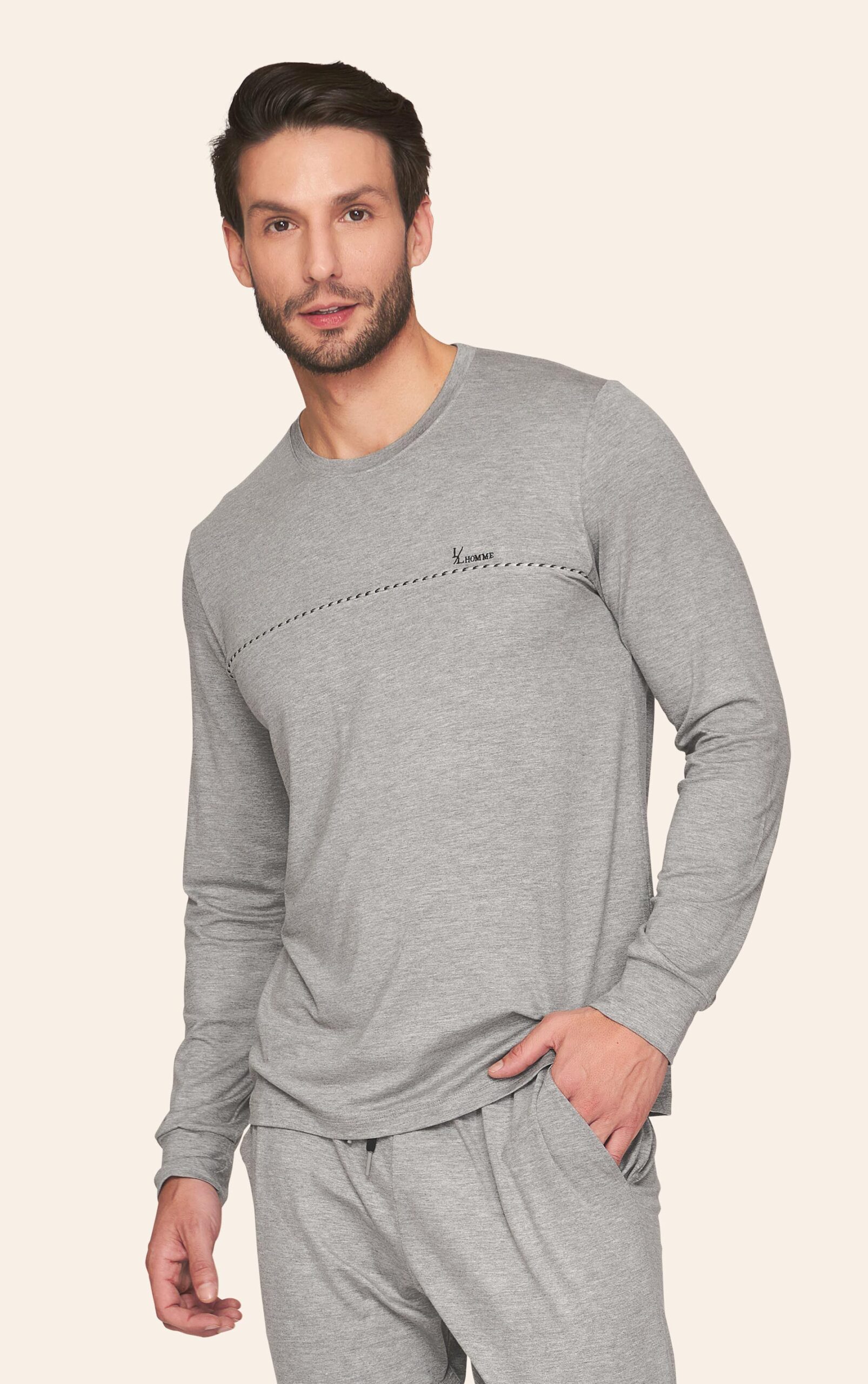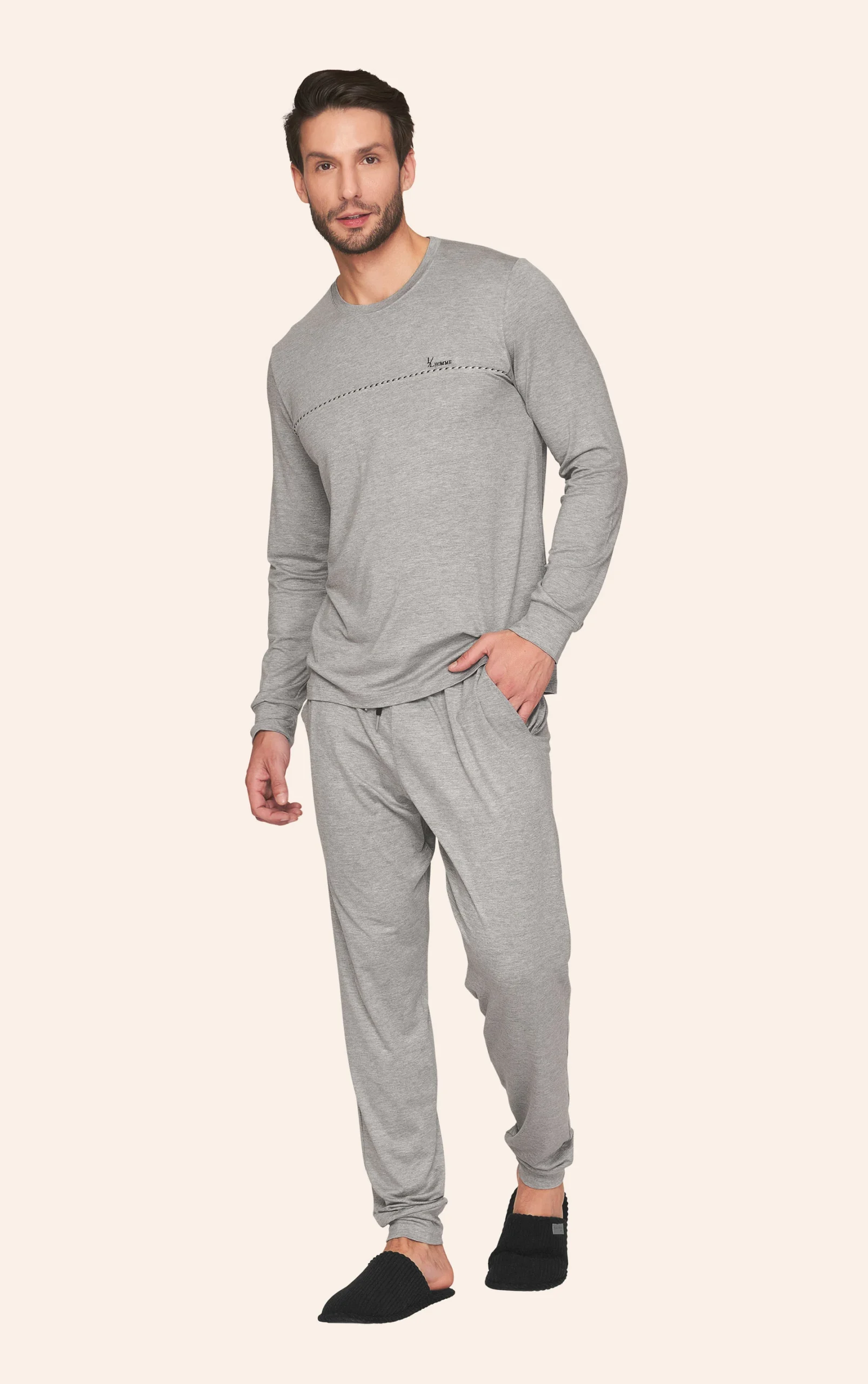 Pijama jogger masculino confeccionado em viscolycra, um tecido de toque macio e caimento leve que proporciona conforto e liberdade de movimentos para os momentos de descanso. A blusa possui modelagem moderna com decote redondo e mangas longas finalizadas com punhos, oferecendo um visual casual e aconchegante. O destaque fica para o cadarço decorativo aplicado na parte frontal e para o bordado, que acrescentam identidade e estilo à peça. A calça jogger complementa o conjunto com modelagem confortável, bolsos laterais funcionais, punhos na barra e cintura com cordão personalizado para ajuste, garantindo praticidade e um ajuste perfeito ao corpo.
