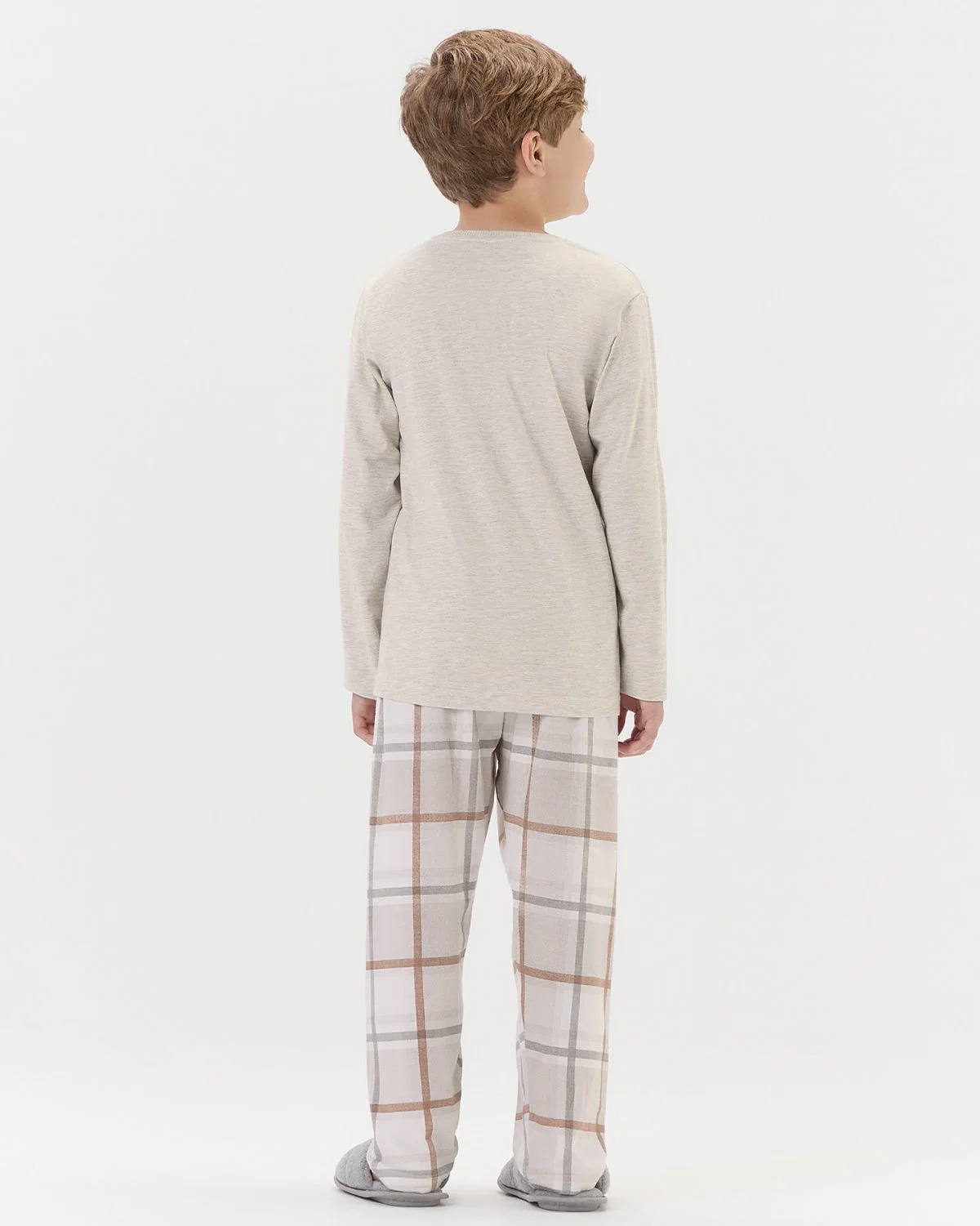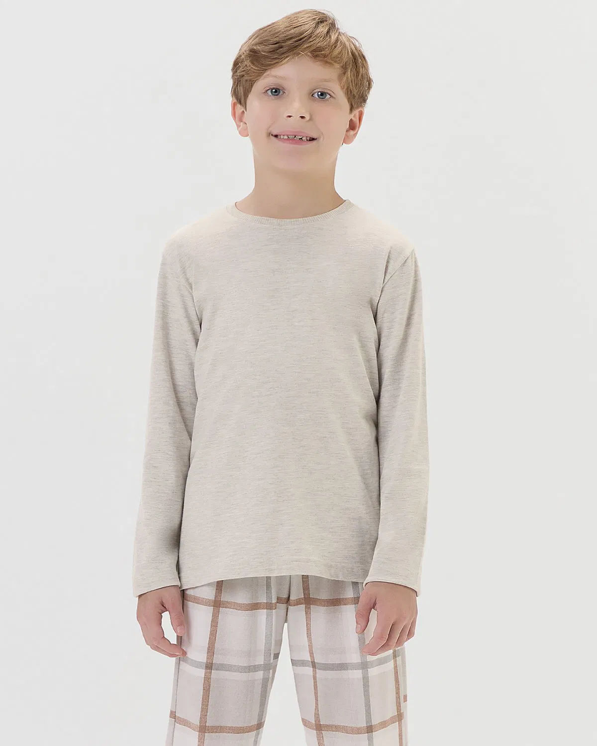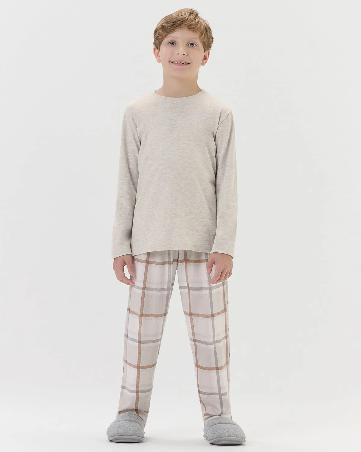 A blusa de manga longa em malha blend proporciona caimento confortável e liberdade de movimento, enquanto a calça combinando apresenta estampa rotativa em xadrez em tons de marrom, conferindo charme, diversão e um visual moderno.