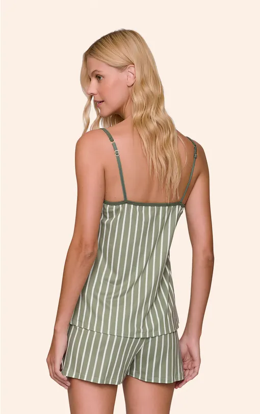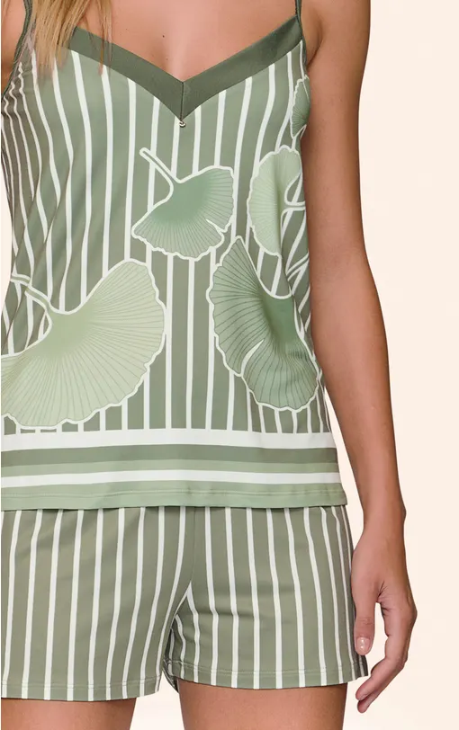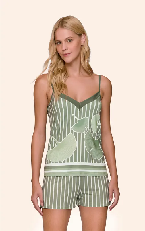 Short doll estampado, confeccionada em sublime touch de toque aveludado. Possui alças finas com ajuste, busto forrado e recorte em cor contrastante no decote. Ela ganha destaque pela estampa localizada em tons de verde “tea” com mix de listra e elementos maiores que fazem parte desse coordenado.